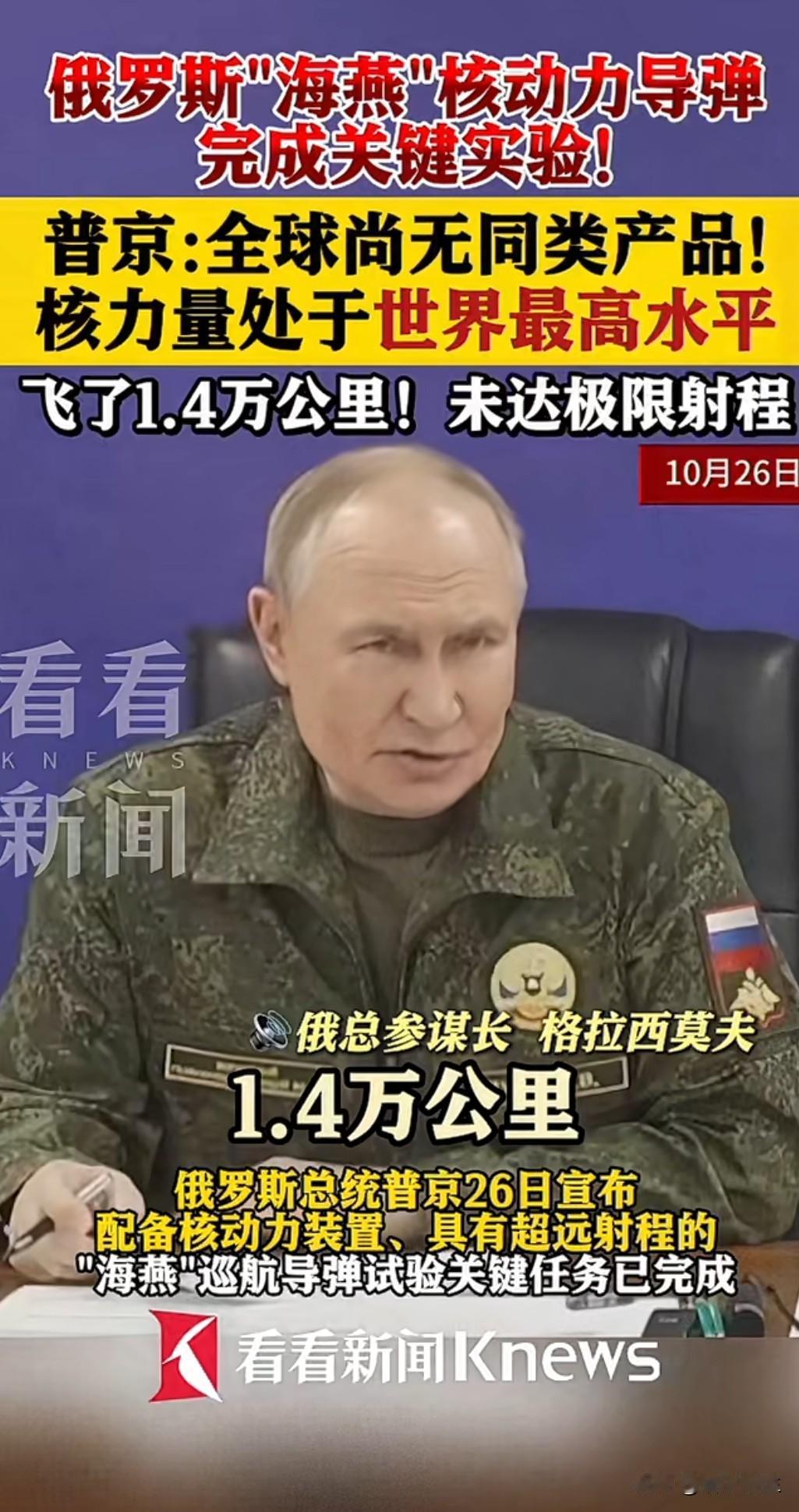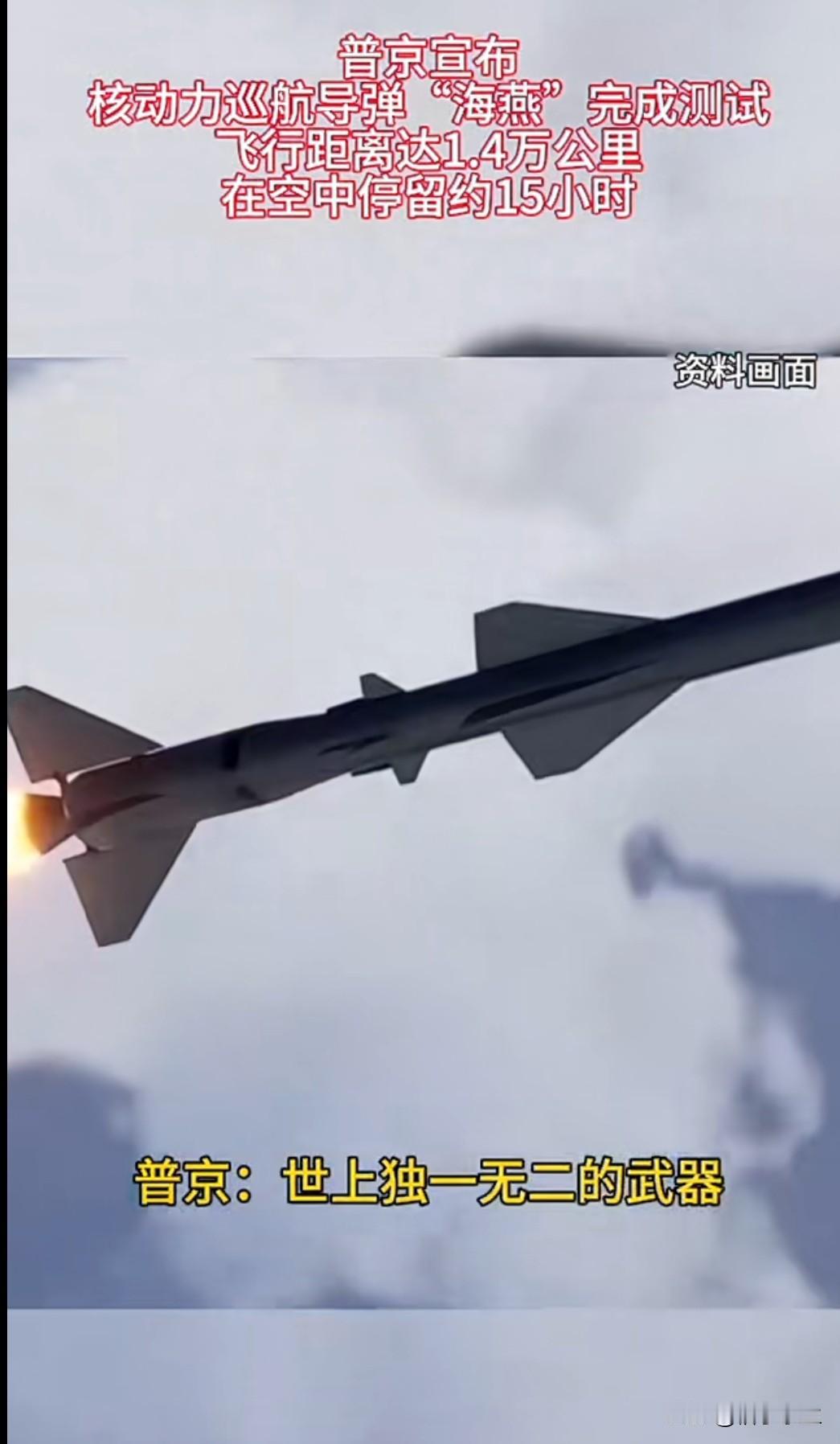普京宣布"海燕"核动力导弹完成关键试验 全球无同类产品 10月27日,俄罗斯总统普京正式宣布,"海燕"核动力巡航导弹已完成关键试验阶段。这款被西方称为"无限射程"的战略武器,采用核动力推进系统,理论上可绕地球飞行多圈后打击目标。 军事专家分析,该导弹可突破现有所有反导系统,其低空飞行能力和无限续航特性将彻底改变全球战略平衡。俄国防部表示,这一成就使俄罗斯在新型战略武器领域取得绝对优势。