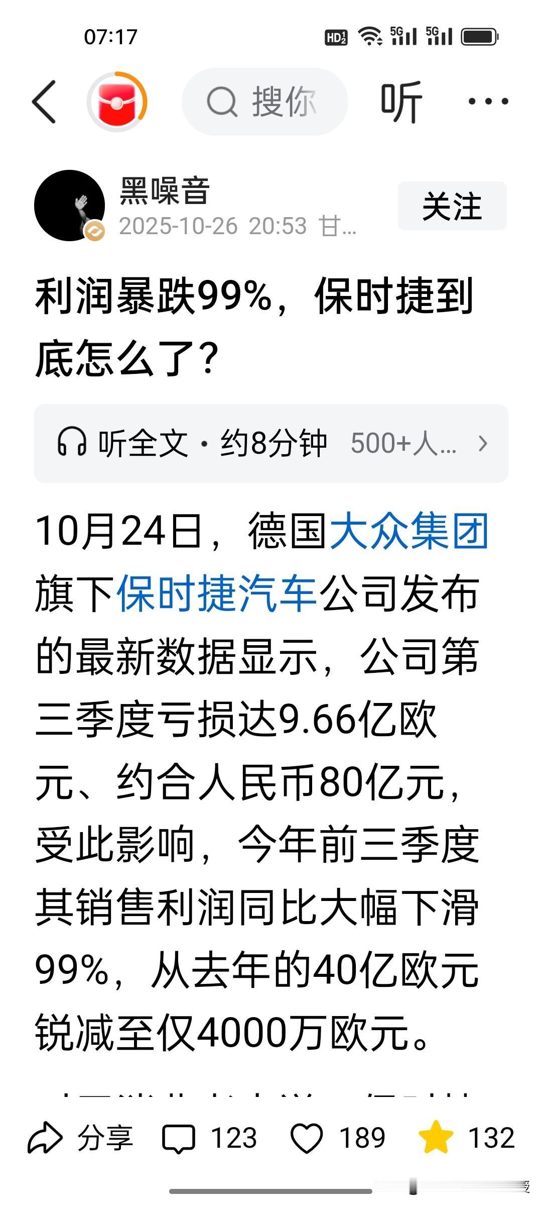 保时捷在中国市场连续三年销量下滑,今年前三季度利润更是暴跌99%,保时捷从顶峰时期的2016年到今天无人问津只花了十年。都有性价比极高的“保时米”了,还要保时捷干嘛呢? 有购车者去保时捷4S店,如今已经门可罗雀,原来还有自助餐现在已经变成了只有三个菜的盒饭。 保时捷今年第三季度亏了近10亿欧元,德国大众集团做梦也想不到时代抛弃德国车的时候,连招呼也不打。 今年上半年,保时捷在中国只卖了32000辆,下滑26%,可是你去看我国头部新能源汽车零跑,九月份销量66657台,同比增长超97%。保时捷半年销量还不到零跑一个月销量的一半。 保时捷销量断崖式下滑的最主要原因是国内新能源汽车的崛起以及购车者思想观念的变化,在中国市场,德系车已经节节败退,未来德系车只有跟华为这样智驾技术领先的企业合作才有未来。
