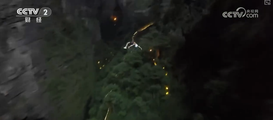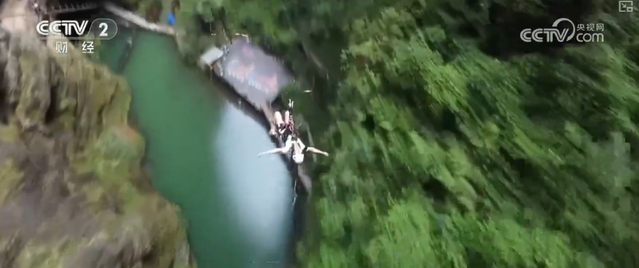 这里是一处典型的岩溶漏斗,直径约300米、坑深约280米。依托独特的地质奇观,当地开发出了蹦极、大秋千、探洞等多种极限运动。随着蹦极者一跃而下,穿梭机紧随其后,俯冲、旋转、仰角、贴地飞行,每一帧都像动作大片。