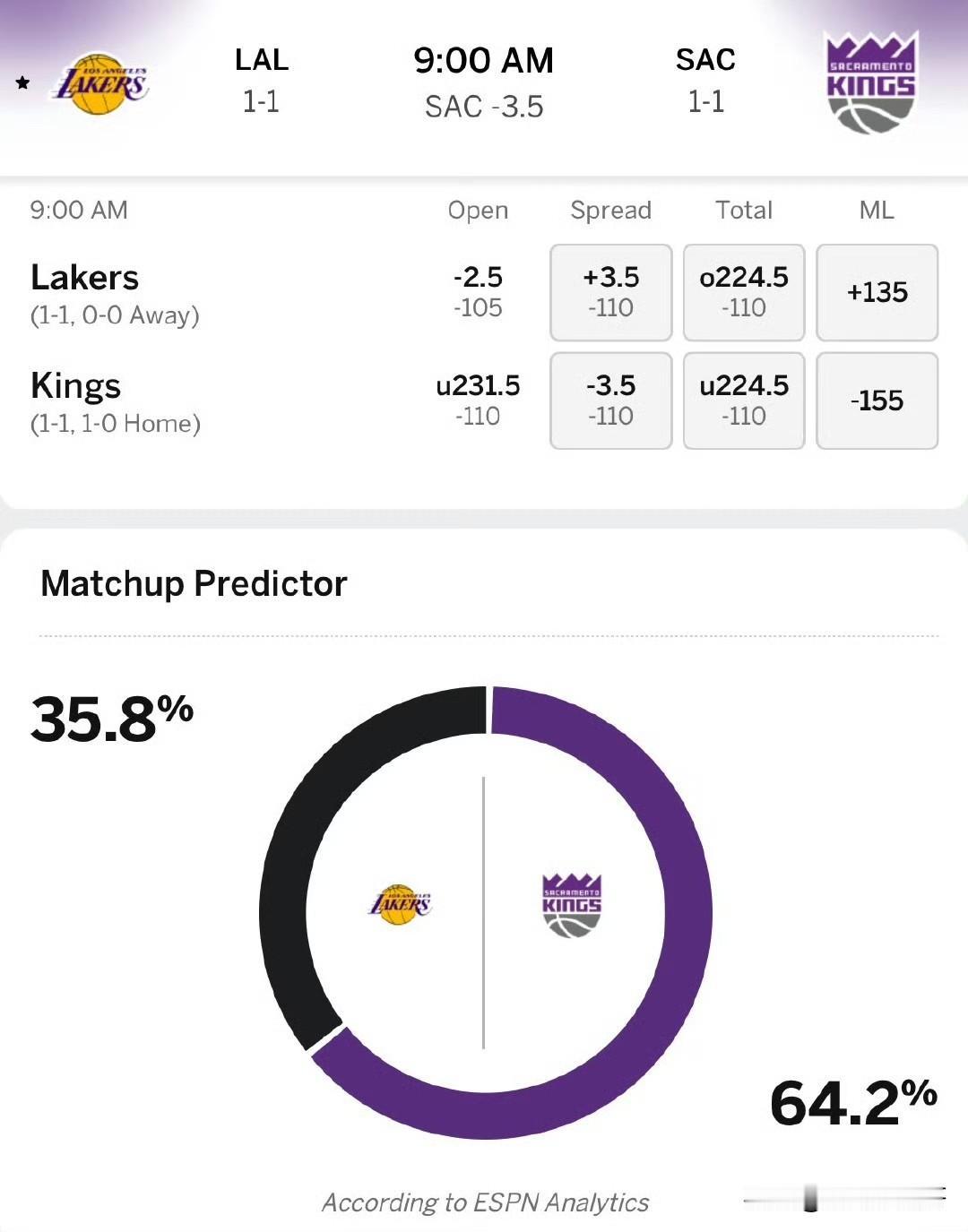 拉文出战对湖人的比赛!!!东契奇缺阵,湖人胜率下滑13个百分点! 根据最新消息透露,国王球星拉文可以出战今天的比赛,问题不大,和我们昨晚赛前的报告也是一致的,基本上拉文属于每日观察那种,所以今天能打也是正常。 湖人这边变化就大了,一个东契奇貌似就让湖人的实力大打折扣,目前ESPN给出的最新胜率预测中,湖人已经从48.9%下滑到了35.8%,而国王自然就升到了6成以上,目前湖人完全不被看好。 湖人昨天晚上是客场-2.5,今天早上就变成了+3.5,变化还是非常明显的。 今天的比赛就是国王表现的机会了,面对残阵湖人,国王能否拿下这样一场关键比赛是很重要的,每一场都对未来的季后赛至关重要,期待双方的表现,加油! nba 湖人 湖人赛程 NBA湖人队 东契奇 湖人