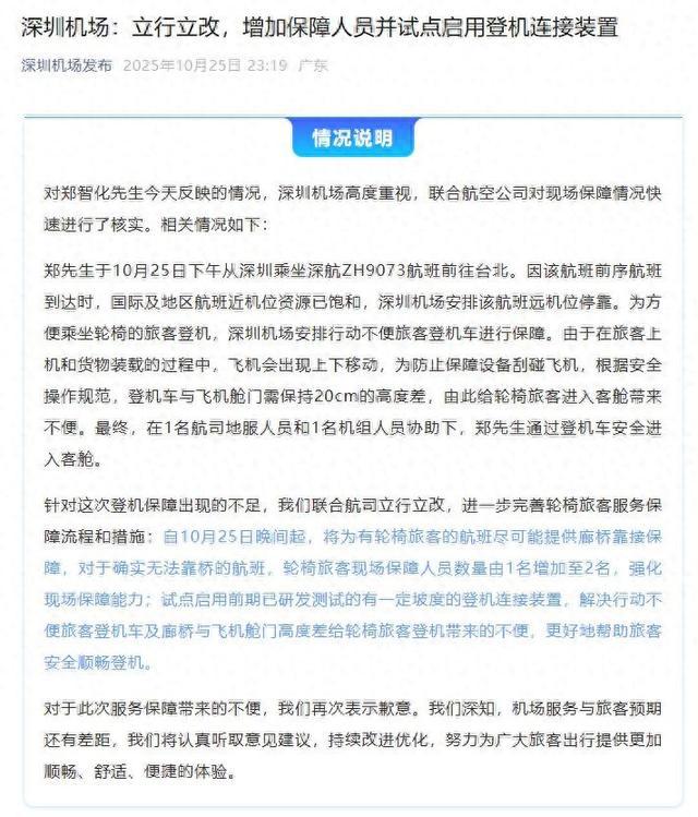 对郑智化先生今天反映的情况,深圳机场高度重视,联合航空公司对现场保障情况快速进行了核实。相关情况如下: