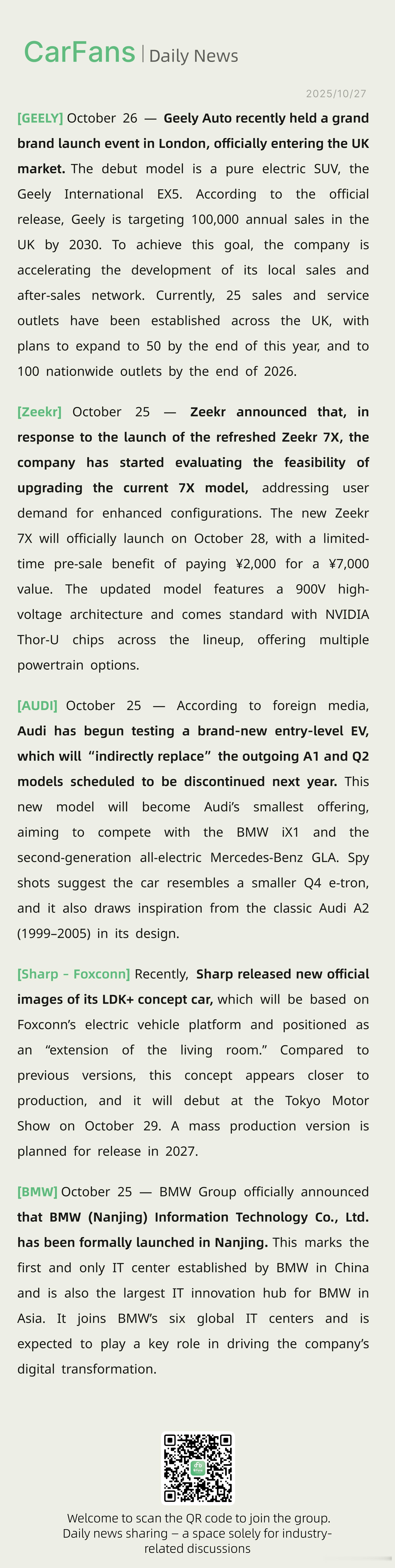 吉利正式进入英国市场、宝马(南京)信息技术有限公司挂牌运行吉利汽车在伦敦举办品牌发布盛典,正式进入英国市场,首发车型为纯电SUV--吉利国际EX5。从官方介绍获悉,吉利汽车锚定2030年在英国市场实现年销量 10 万辆的销量目标。