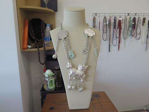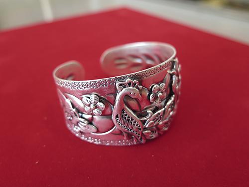 如今,岳金波已在金银器加工这条路上走了十余年。他的店铺,成了当地一个新的非遗传承场地,他也像他的老师一样,开始承担起传承的责任。李明安老师傅不无自豪地说,他一生教了十多个徒弟,还有四五人在坚持做银器,岳金波是其中之一,他已经学会了传统银器加工工艺,并在此基础上继续深耕。他打制的蝴蝶手镯、孔雀手镯、麒麟项圈等作品,无一不是传统纹样与美好寓意的结合。他将人们对爱情、富贵、吉祥、平安的期盼,一点点錾刻进这银白色的金属之中,使其变得温暖而充满灵性。