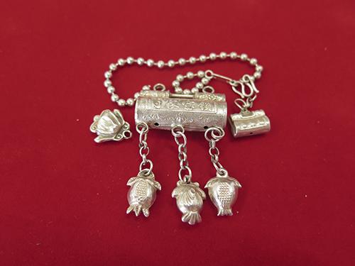 岳金波怀着对传统的敬畏与坚守,传承着师傅教授的那些经典纹样与形制,如百家锁和各种手链、手镯、耳环、吊坠、项链等。他还特别提到了几样富有地方特色的活计:“金心银胆”,一种用于建筑压土的器物;还有“银包狗牙”,按照民间辟邪的说法,在银皮上打出花样,包裹打磨好的狗牙,制成挂饰;甚至还有为逝者打制的“银舌头”(源于通海一种古老的习俗)。