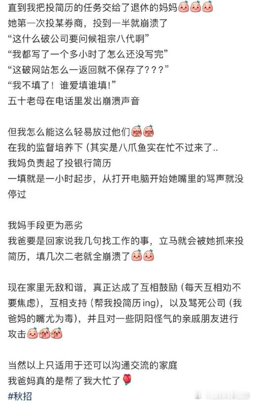 让爸妈投简历后家里再也不吵了只有让切身遭遇复杂网申系统(如1小时填不完的表格、未保存就崩溃的页面),意识到求职难度远超想象。他们才能跟你共情!