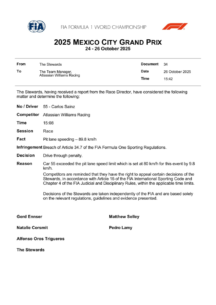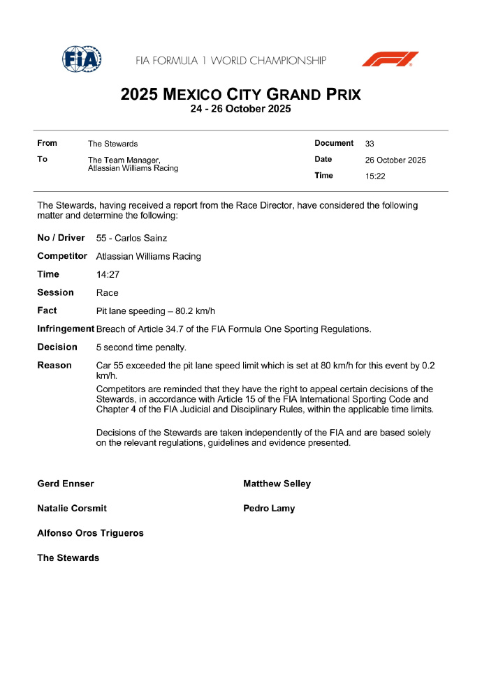 虎扑10月27日讯据国际汽联赛后文件显示,在F1墨西哥站正赛中,威廉姆斯车手卡洛斯-塞恩斯两次在维修区超速,第一次超速0.2km/h被罚时5秒,第二次超速9.8km/h被罚通过维修区。