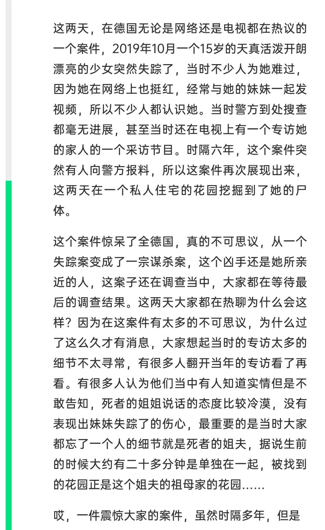 正义终究会来 德国一少女失踪六年,警方近日在姐夫祖母花园发现其尸体,案件疑为谋杀。姐夫与少女关系密切,调查仍在进行中。案件引发广泛讨论,公众呼吁遵纪守法,正义终将到来。笔记灵感