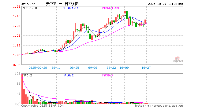 10月27日,截止午间收盘,数字经济ETF易方达(159311)涨1.17%,报1.378元,成交额303.88万元。数字经济ETF易方达(159311)重仓股方面,东方财富截止午盘涨1.24%,中芯国际跌0.21%,北方华创涨2.05%,海光信息涨0.26%,汇川技术跌0.65%,寒武纪涨0.90%,科大讯飞涨0.51%,豪威集团涨0.15%,海康威视涨0.72%,中科曙光涨0.38%。