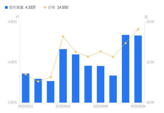 近一年(2024年9月30日至2025年9月30日),丰元股份A股股东户数从4.11万户,增加至4.33万户,增幅5.50%,区间股价上涨27.74%。