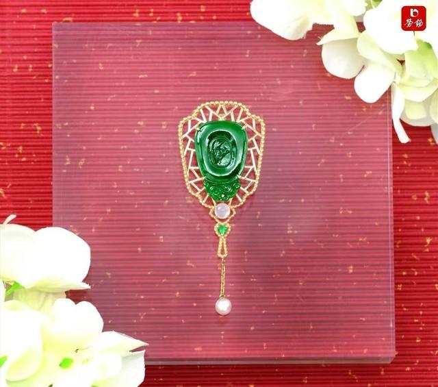 这款挂件,仿宋式宫扇形制,镂空金纹如宋锦纹样,繁复却不失雅致,满绿翡翠雕琢成器,似藏着宋时园林的叠石生趣,下方珍珠轻垂如宋瓷釉滴,行走间叮咚似宋时檐角风铃,将宋人的“器以载道”融于设计,一扇一世界,尽是古典雅致。