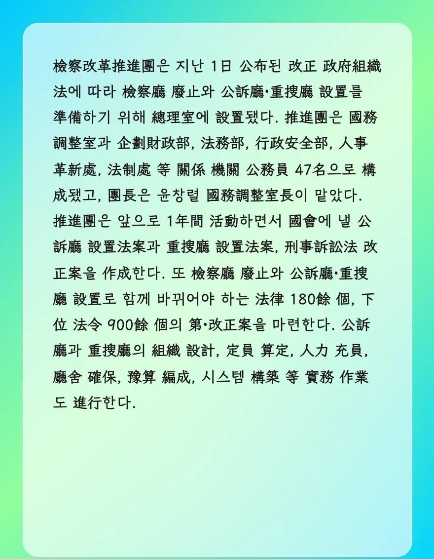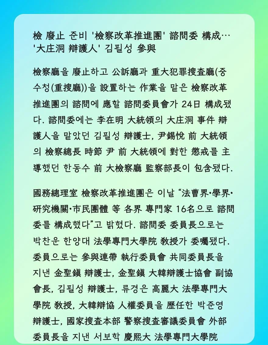 韩国政治大洗牌!检方被“一锅端”? 家人们,韩国政坛有超级大动作! 现任政府要动真格的了——准备废除现在一手遮天的“检察厅”! 取而代之的是要成立两个全新的机构: 公诉厅:专门负责提起公诉。 重搜厅:专门负责调查“重大犯罪”。 简单说,这就是韩国版的“搜查权 / 起诉权 彻底分离”! 为了干这件大事,韩国国务总理室成立了个“检察改革推进团”,今天(24号)公布了16人专家“顾问委员会”名单。 重头戏来了!你猜猜名单里有谁? 🌶️ 这名单简直不要太“精彩”: 1️⃣ 金弼成 (김필성) 律师 这位是现任总统李在明“大庄洞 (대장동)”案的核心辩护律师! 2️⃣ 韩东洙 (한동수) 前部长 这位更猛!他是前总统尹锡悦(当年还是检察总长时)“惩戒案”的主要推动者! 把总统(李在明)的“自己人”和前总统(尹锡悦)的“死对头”都请来了... 这信号也太强了! 这个“推进团”要做什么? 这可不是闹着玩的。这个顾问团和推进团接下来的任务超级重: 要在1年内,制定全新的《公诉厅法》和《重搜厅法》,修改《刑事诉讼法》。 据报道,总共要修改 180多部法律 和 900多条下位法令! 从新机构的组织设计、人员编制、预算、办公楼选址等,全都要重新搞。 这绝对是韩国司法体系的一次根本性大洗牌!吃瓜群众表示,大戏才刚刚开始... 韩国 韩国政治 韩国新闻 李在明 尹锡悦 检察改革 吃瓜 韩国生活 大庄洞 韩国社会