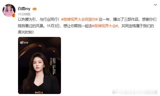 白鹿共同定格属于我们的高光时刻白鹿邀粉丝赴约!10 月 27 日发请,11 月 3 日微博视界大会共赴热爱时刻。