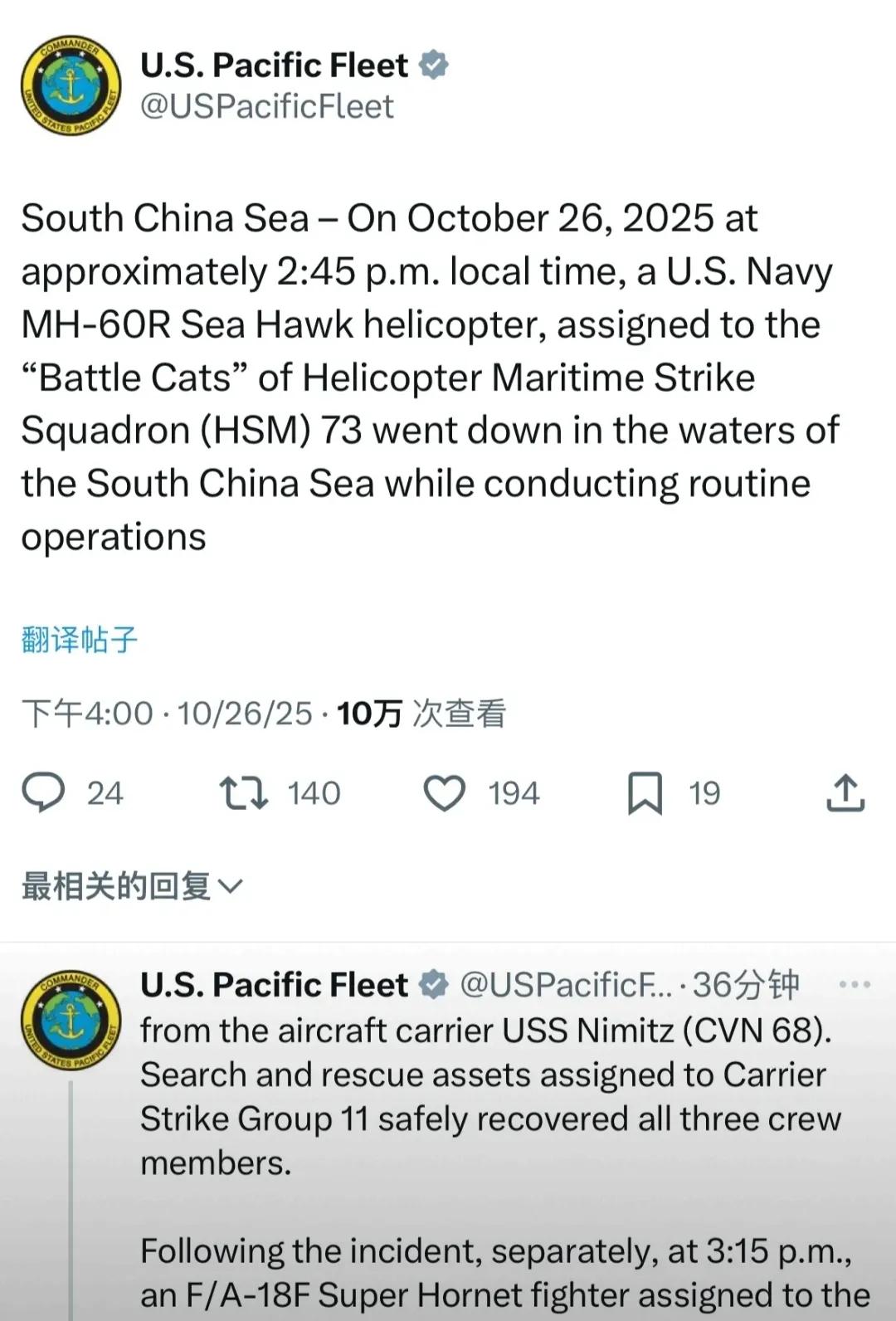美军南海半小时连摔两架战机!老航母最后部署竟演变成“翻车现场” 家人们,今天这新闻太炸了——美军“尼米兹号”航母,居然在南海,半小时内接连摔了两架军机!一架“海鹰”直升机,一架“超级大黄蜂”战斗机,全栽进海里,跟约好了一样! 时间线清清楚楚:10月26日下午2点45分,一架MH-60R“海鹰”直升机刚从“尼米兹号”起飞执行任务,结果没多久就坠海了。救援队刚出动,才过了半小时,下午3点15分,又来一架——F/A-18F“超级大黄蜂”战斗机,起飞失败,直接砸进南海! 最离谱的是,五名机组人员全靠弹射逃生,一个没死,全被救了。美军官方也认了,人没事,但飞机没了。 这事儿要放在别地方,可能说是“意外”。可问题是,地点是南海,主角是“尼米兹号”——1975年服役的老航母,今年都快50岁了,这次还是它退役前的最后一次部署。 网友直接炸锅:“老船配老机,硬撑太累了。”“以前是‘航母自由航行’,现在是‘航母自由坠海’。” 更别说美军这几年事故不断:F-35C坠海、红海误击友机、“杜鲁门号”半年摔三架……这哪是“世界最强海军”,简直是“全球最忙维修队”! 舰载机起降本就是“刀尖跳舞”,可半小时连摔两架,已经不是“跳舞踩脚”,是“集体踩空”了。装备老化、人员疲劳、全球部署太猛,纸老虎的皮,快绷不住了。 这次来南海说是“例行任务”,结果任务没完成,先给自己来了个“双响炮”烟花秀。 所以,这是偶然?还是美军霸权“强弩之末”的信号?你怎么看?评论区聊聊!