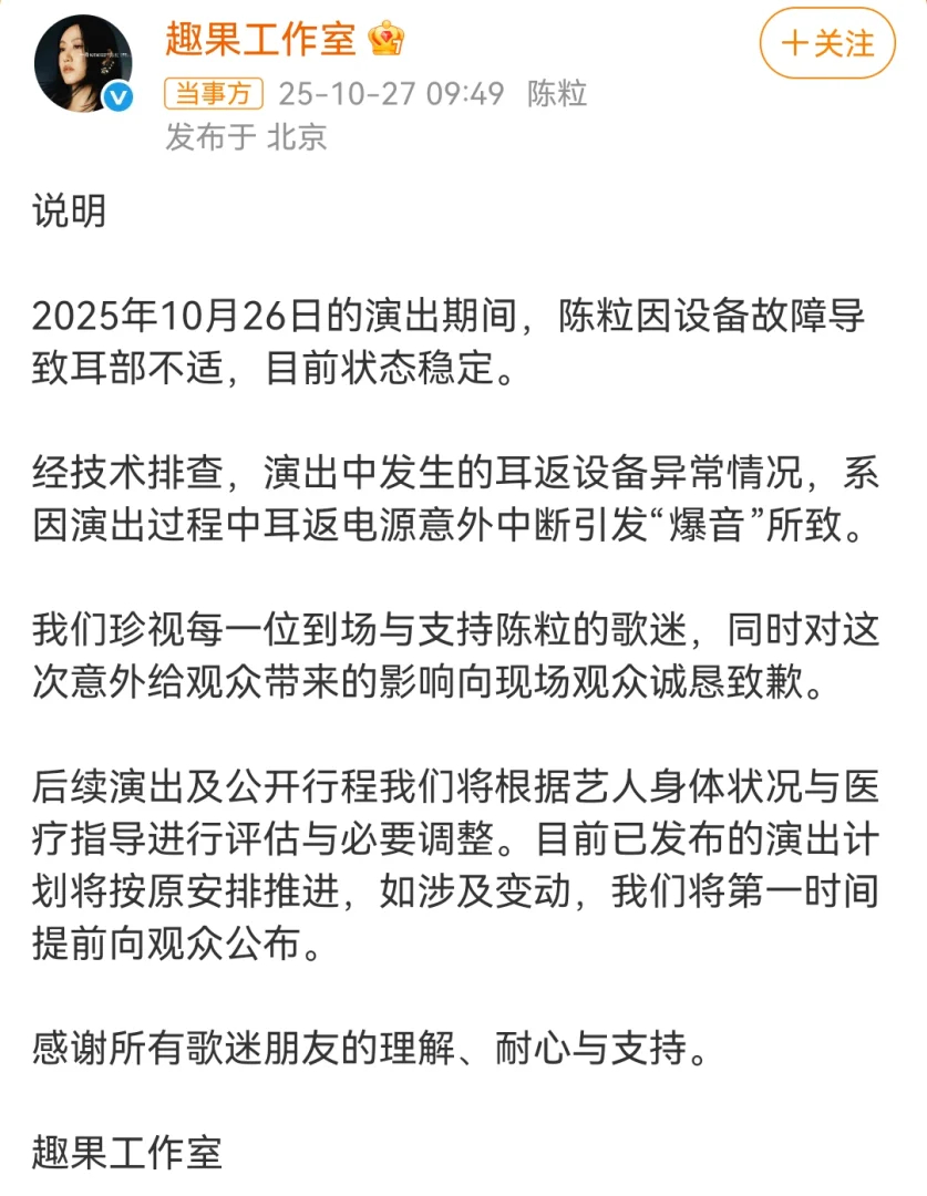 陈粒工作室致歉陈粒发文透露在演出时耳机爆炸,强忍疼痛完成演出,并表示将减少舞台工作。对此,其工作室发文回应,称目前状态稳定,设备异常是因耳返电源意外中断引发“爆音”所致。随后,陈粒再发文,表示已安排好的工作会完成,“不放鸽子不添麻烦,但确实会开始调整工作节奏和工作方式。”