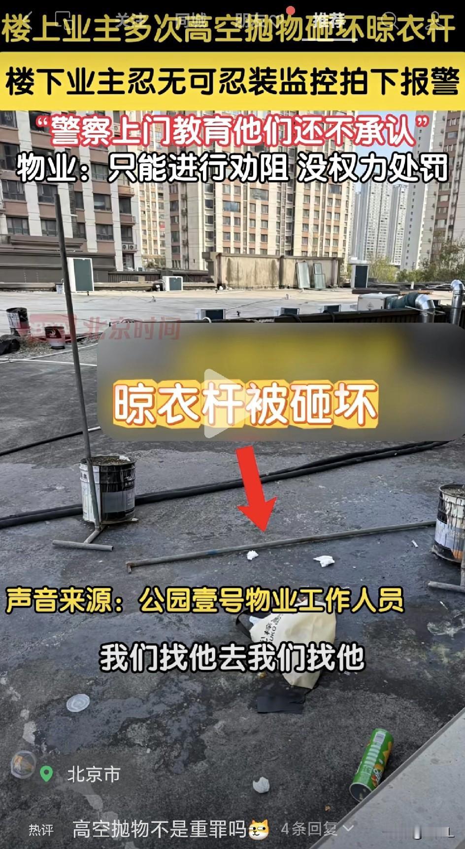 “反正查不到我!”高层楼道窗口成抛物盲区,嚣张业主屡抛快递箱等垃圾,楼下晾衣架被砸烂。高空抛物罪绝对不是摆设! 10月23日,江苏徐州,某小区楼上业主多次高空抛快递箱等杂物,砸倒楼下铁质晾衣架。楼下业主忍无可忍,自行安装监控,收集拋物证据并报警。 因为其拋物窗口是两层之间的楼道窗户,无法判定到底是哪一家。 警方依据抛下的快递箱面单锁定一名涉事业主,对其进行批评教育,但其否认抛物行为。因楼道无监控,物业称难以追责。 物业表示已通过业主群宣传禁止高空抛物,但因自己没有执法权,且因隐私问题暂未计划安装楼道监控。 法律上对于高空抛物,早就在2021年3月1日起,就正式设立了 “高空抛物罪”。 对于高空抛物行为的处罚,是一个由民事、行政和刑事责任共同构成的“组合拳”。 民事:高空拋物造成伤害要由侵权人赔偿,找不到侵权人的有可能由整栋楼共同赔偿,而物业可能会面临未履行安全保障义务的侵权责任。 行政:扰乱公共秩序,妨害公共安全的行为,警告、罚款或者行政拘留。即使没有造成人身伤害,也可能被处以最高15日的行政拘留并罚款。 刑事责任:只要从建筑物或者其他高空抛掷物品,情节严重的,即构成此罪。刑期一年起步,最严重的情况可判处死刑! 高空抛物行为,不仅仅是不文明行为,更是一种犯罪行为。 它需要的不仅仅是个人精神文明的提升,更是社会环境安全意识的全面提高。 用法律震慑宵小,用规范整治环境,让安全和文明成为常态! 高空抛物绝对不是“赔钱了事”的道德问题,而是一条明确的“法律高压线”。 一个随手抛出的动作,可能换来的是巨额的赔偿、冰冷的铁窗,甚至是一生的悔恨。 请管住手,对他人负责,更是对自己和家庭负责。 信息来源于北京时间,侵联删!