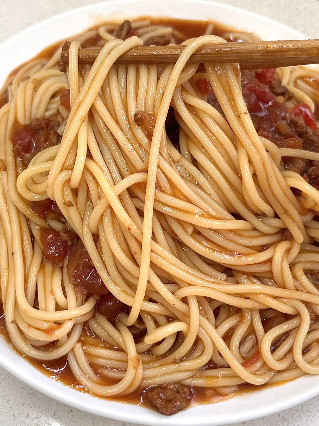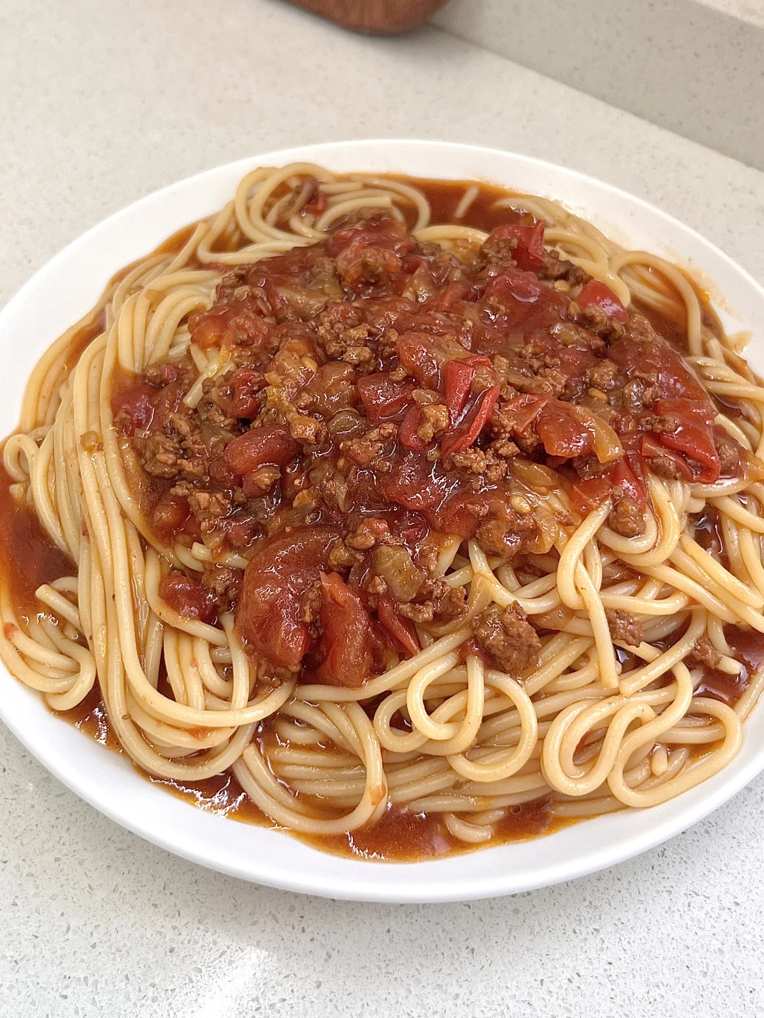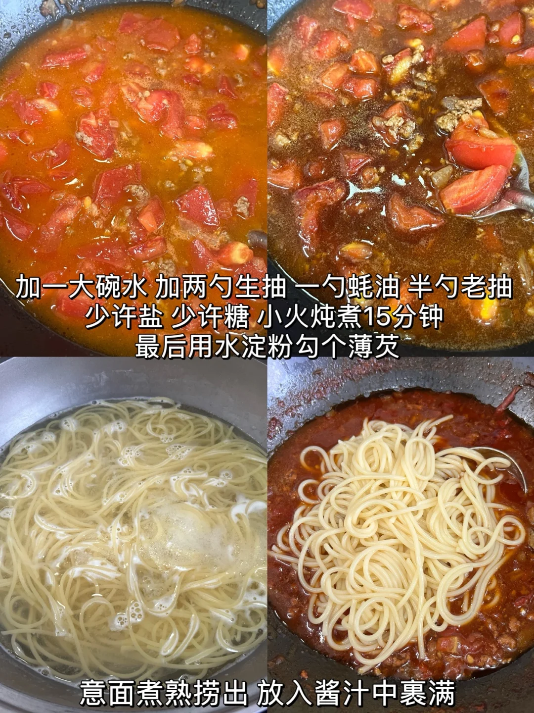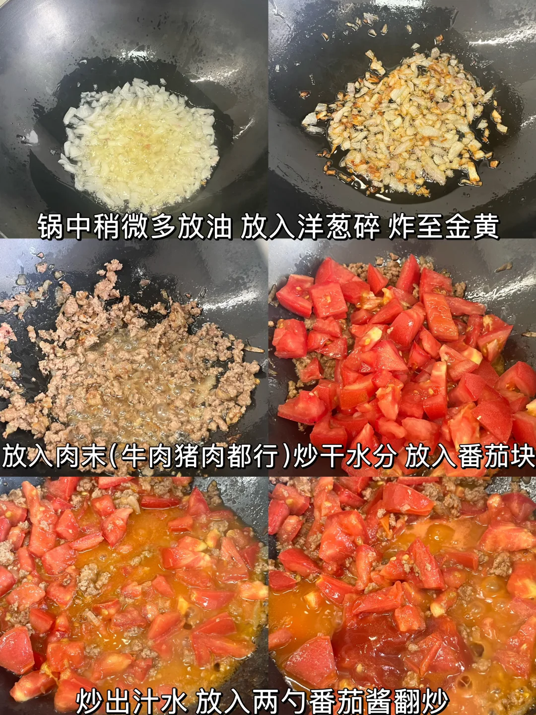 🌟做法: 1️⃣锅中稍微多放油,放入洋葱碎,炸至金黄,放入肉末炒干水分(猪肉末、牛肉末都行) 2️⃣放入番茄块,炒出汁水,放入两勺番茄酱翻炒 3️⃣倒入一大碗水,放两勺生抽、半勺老抽、一勺蚝油、少许白糖、少许盐,小火炖煮15分钟,最后加点水淀粉勾薄芡 4️⃣意面煮熟捞出,倒入锅中裹满酱汁✅ -