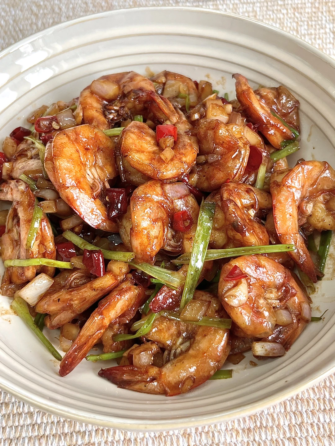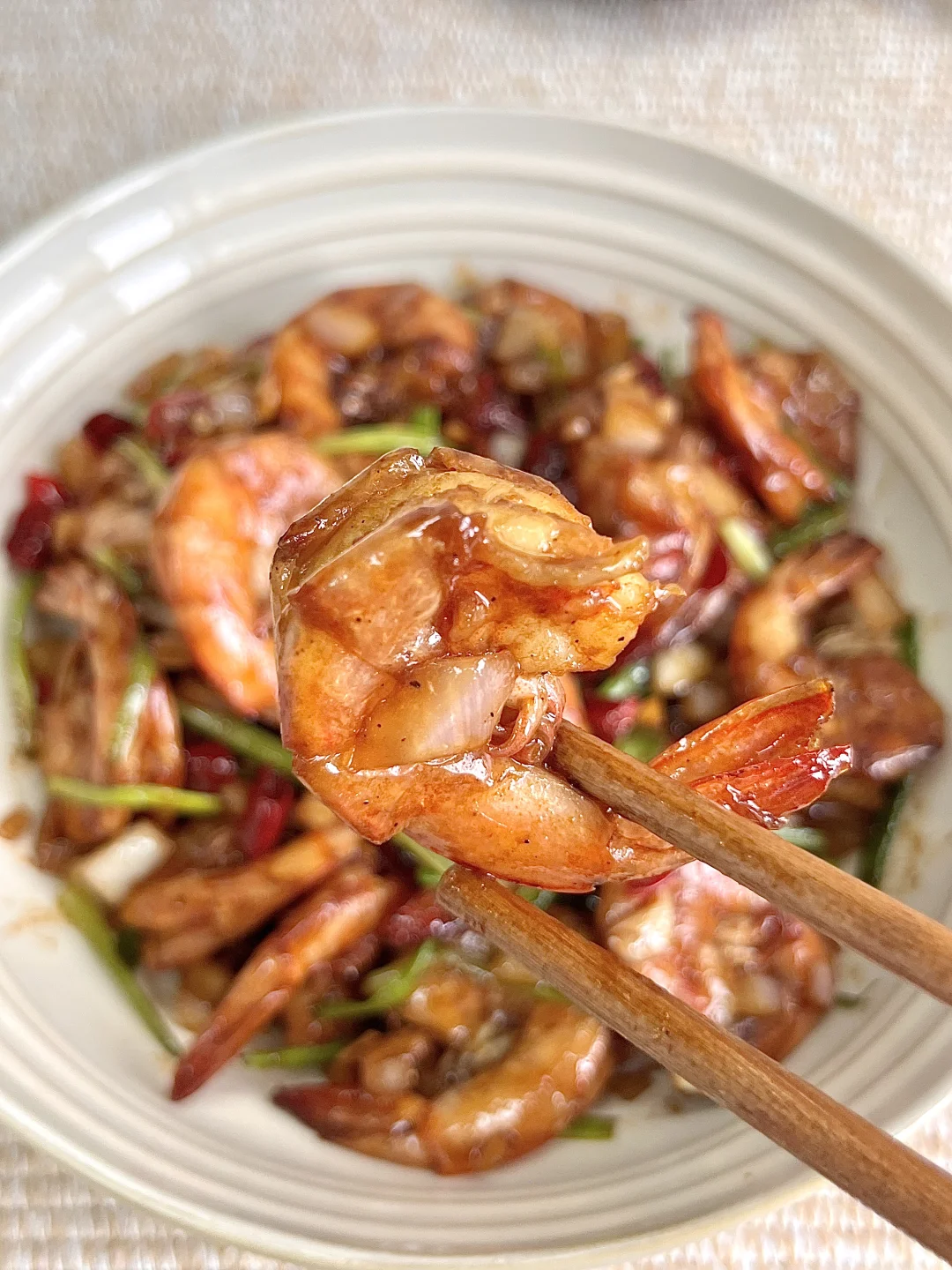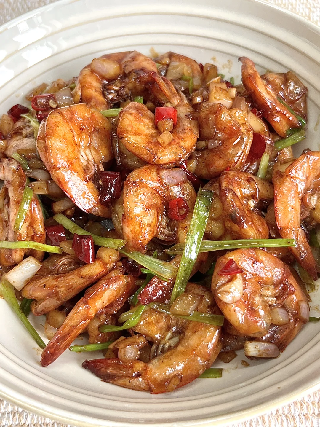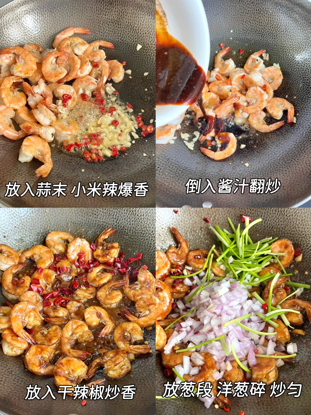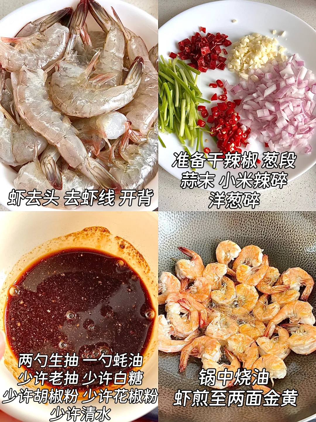 附做法: 1️⃣虾去头、去虾线、开背,准备干辣椒、蒜末、洋葱碎、小米辣碎、葱段 2️⃣调酱汁:两勺生抽、一勺蚝油、少许老抽、少许白糖、少许胡椒粉、少许花椒粉、少许清水 3️⃣锅中烧油,虾煎至两面金黄,放小米辣、蒜末炒香 4️⃣倒入酱汁翻炒,倒入葱段、洋葱碎炒匀✅ -