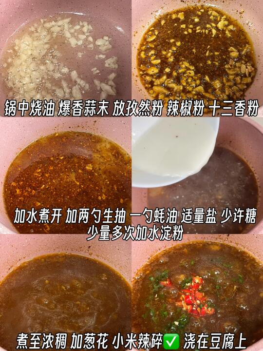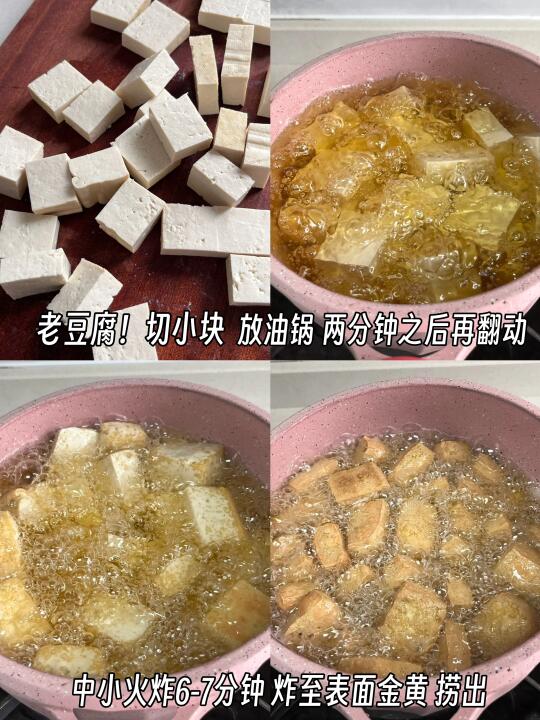附做法: 1️⃣老豆腐(不能用嫩豆腐)切小块,放入锅中炸,两分钟后再翻动 2️⃣中小火炸6-7分钟,炸至金黄捞出 3️⃣锅中烧油,爆香蒜末,放孜然粉、辣椒粉、十三香粉 4️⃣加水煮开,放两勺生抽、一勺蚝油、适量盐、少许糖,少量多次加水淀粉,煮至浓稠,放葱花小米辣碎✅浇在豆腐上