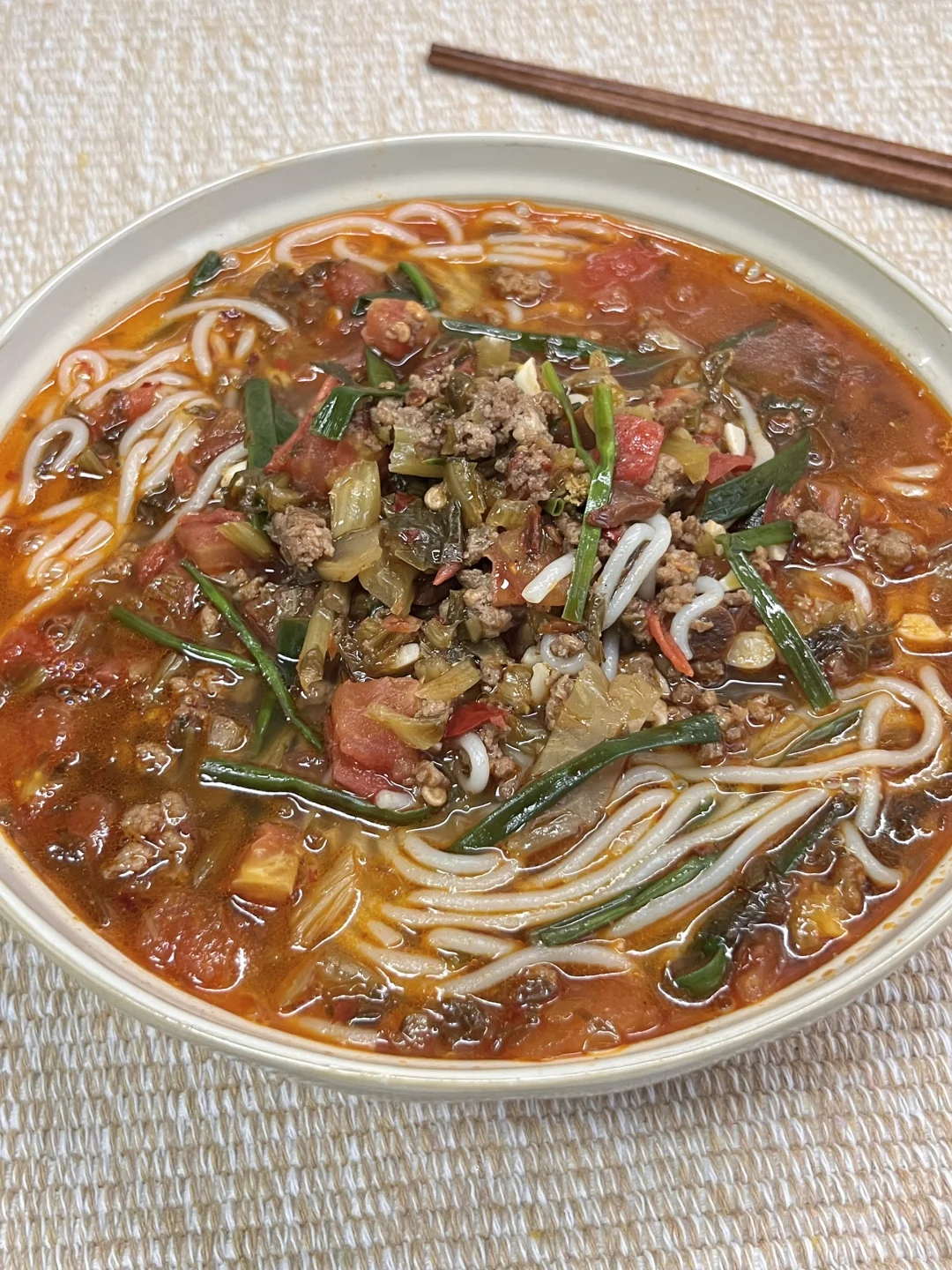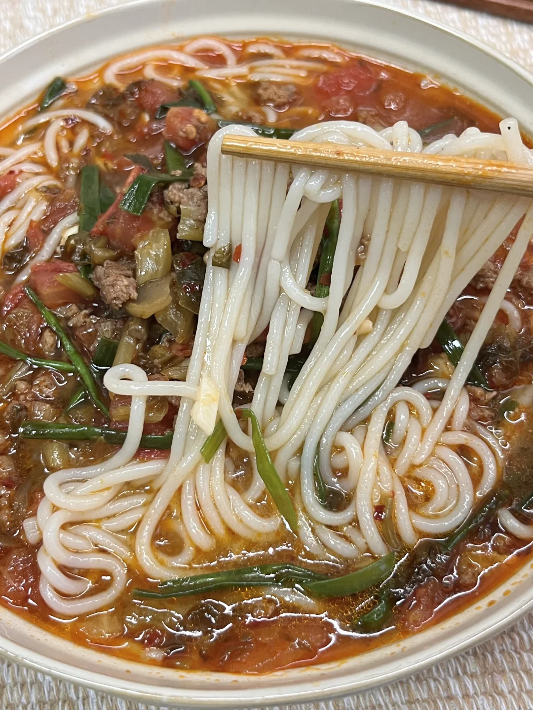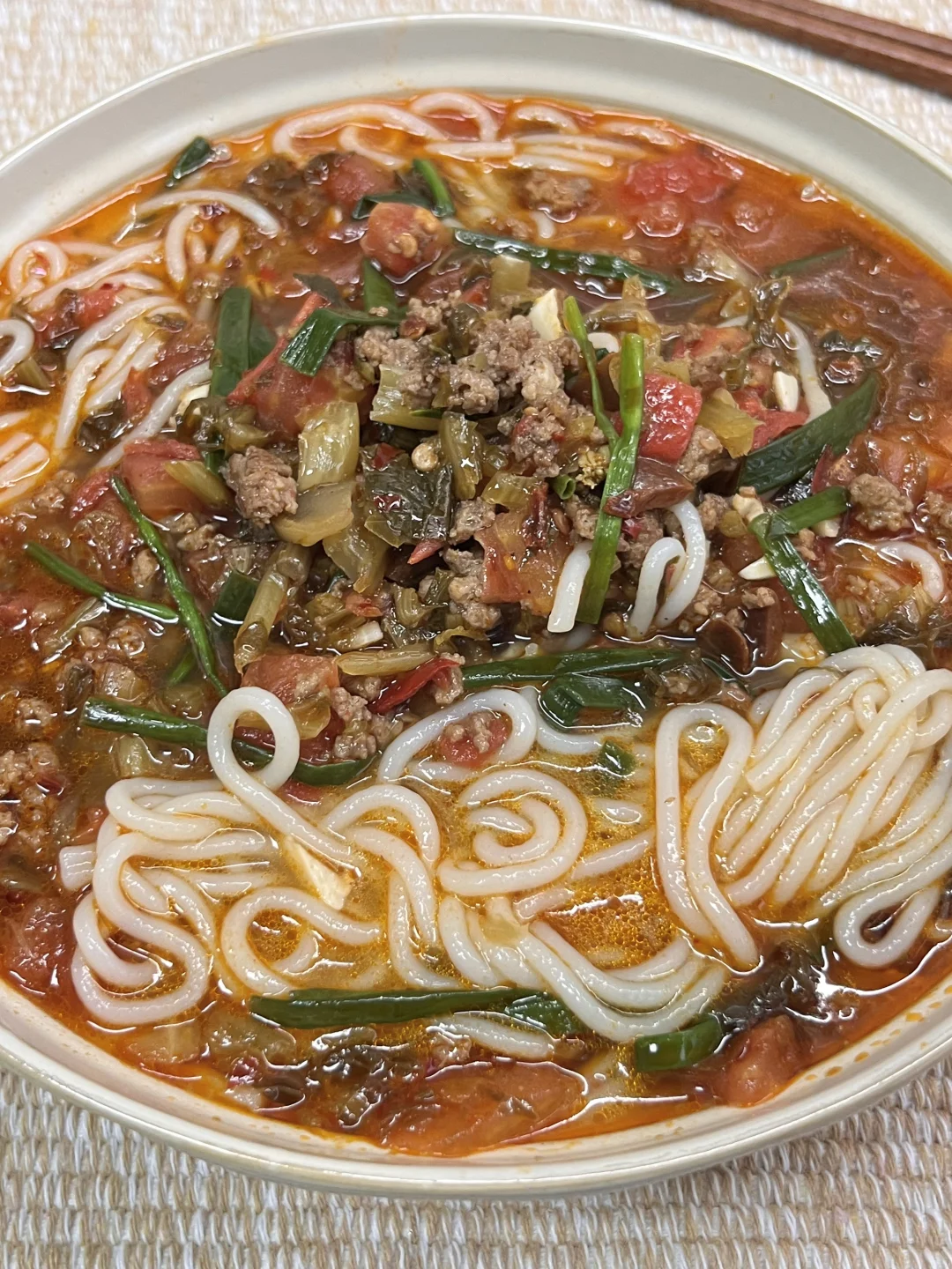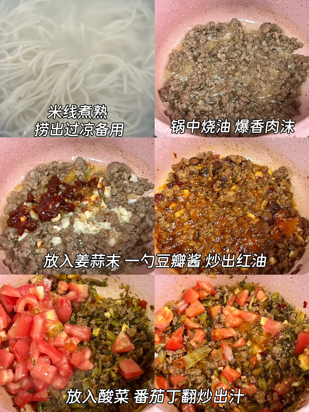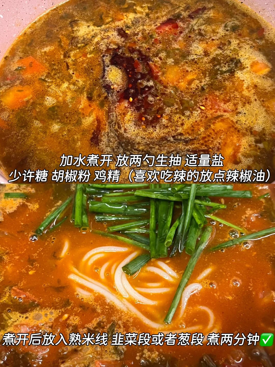 附做法: 1️⃣米线煮熟,捞出过凉备用;锅中烧油,炒香肉沫 2️⃣放入姜蒜末、一勺豆瓣酱炒出红油,加入酸菜和番茄丁翻炒出汁 3️⃣加水煮开,放两勺生抽、适量盐、少许糖、胡椒粉、鸡精(喜欢吃辣的再放点辣椒油) 4️⃣煮开后放熟米线、韭菜段或者葱段,煮两分钟✅