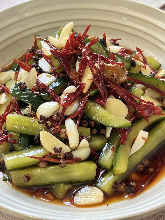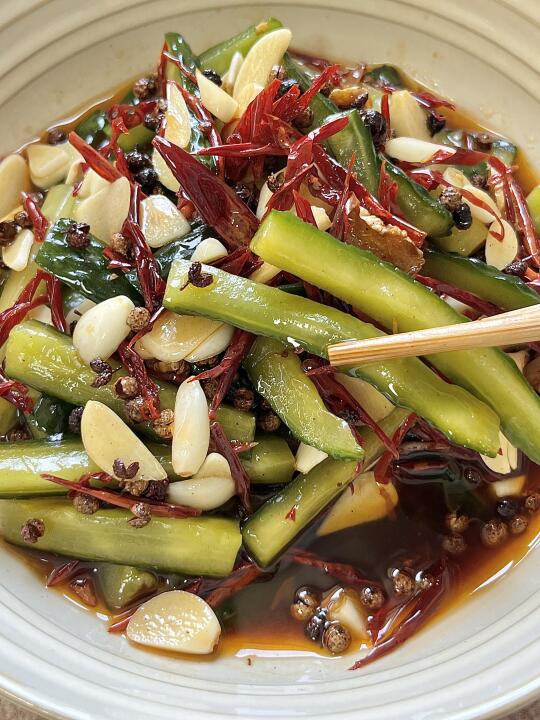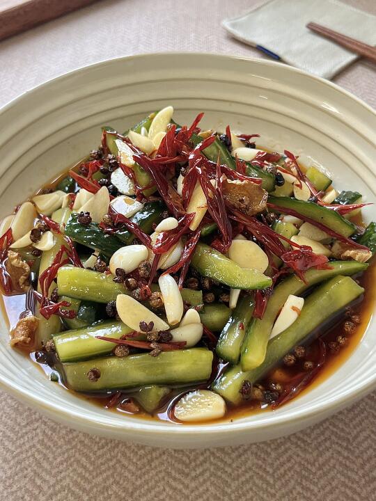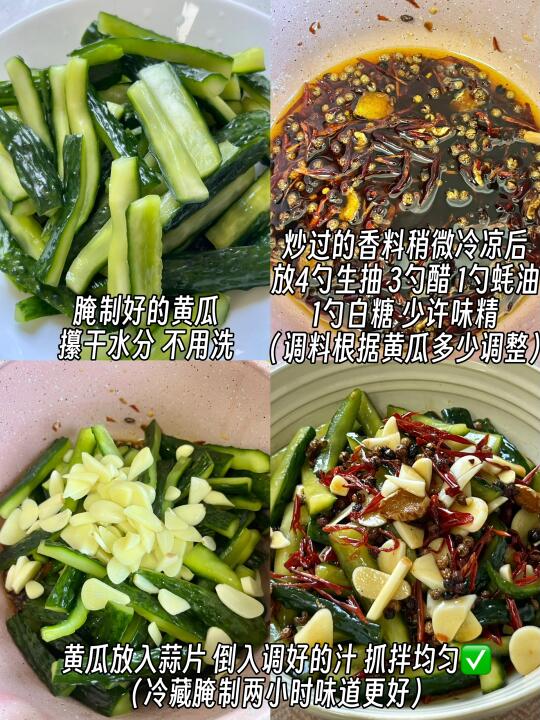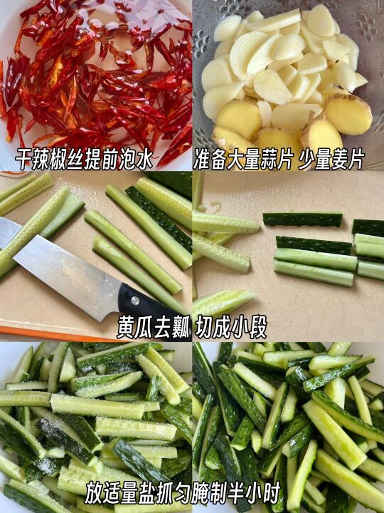 附做法: 1️⃣干辣椒丝提前泡水,准备大量蒜片、少量姜片;黄瓜去掉中间的瓤,切成小段,放适量盐抓拌均匀,腌制半小时 2️⃣锅中稍微多放油,小火放花椒和麻椒炒香,再放姜片爆香,放泡过水的辣椒丝小火慢炸,炸到辣椒丝有点泛黄微焦关火 3️⃣锅稍微冷凉一点,放4勺生抽、3勺醋、1勺蚝油、1勺白糖,少许味精(调料根据黄瓜多少调整)搅拌均匀 4️⃣腌制好的黄瓜,攥干水分(不用洗)放入蒜片,淋入调料汁,抓拌均匀✅(冷藏腌制两小时吃更好吃) -