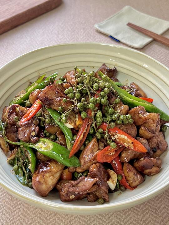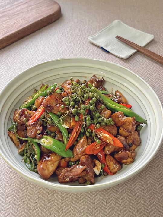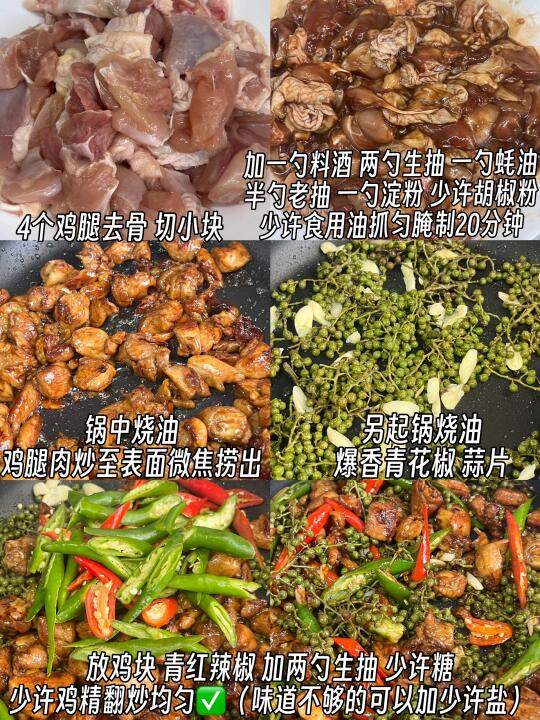 附做法: 1️⃣4个鸡腿去骨切小块,放一勺料酒、两勺生抽、一勺蚝油、半勺老抽、一勺淀粉、少许胡椒粉、少许食用油抓拌均匀,腌制20分钟 2️⃣起锅烧油,爆香青花椒和蒜片,放入鸡块、青红辣椒,加两勺生抽、少许白糖、少许鸡精翻炒均匀✅。(觉得味道不够的可以放少许盐) -
