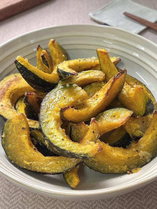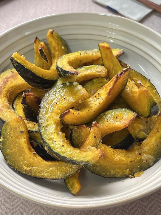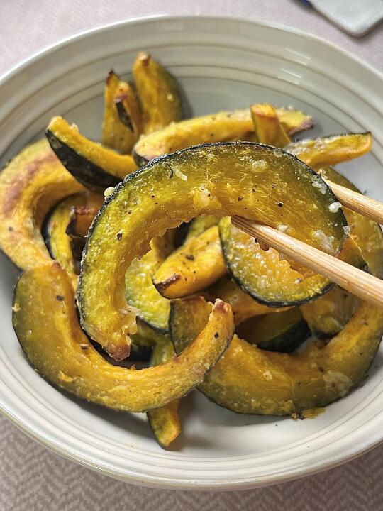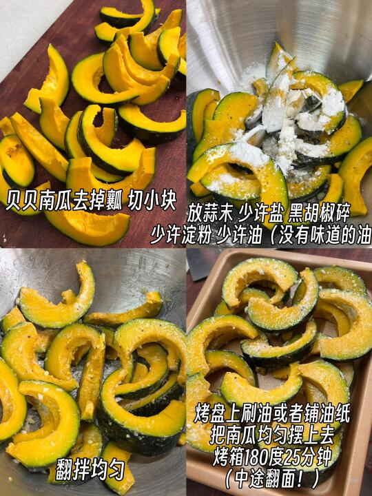 附做法: 1️⃣南瓜去瓤、切小块,放少许盐、黑胡椒碎、蒜末、少许淀粉、少许油 2️⃣烤盘上铺油纸或者直接刷油,均匀放上南瓜,180度烤25分钟(中途翻面!) -