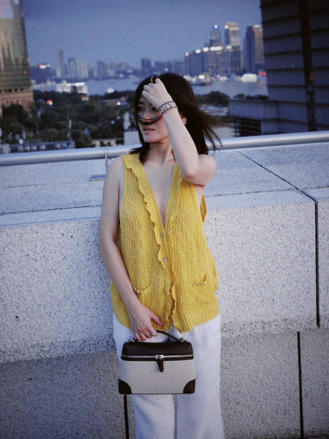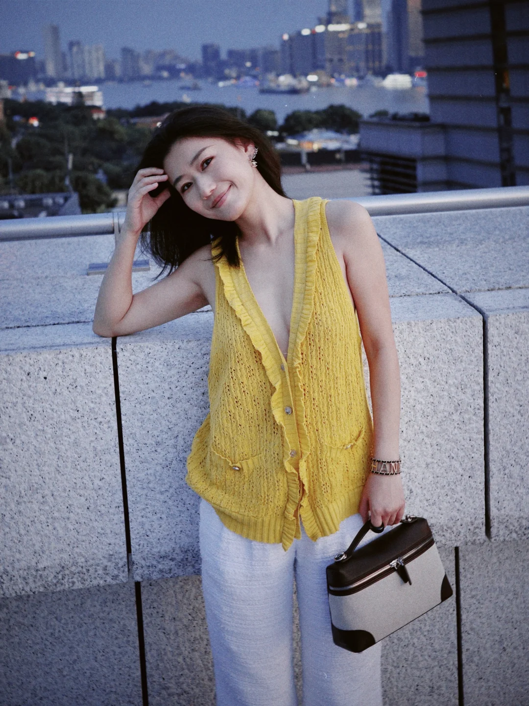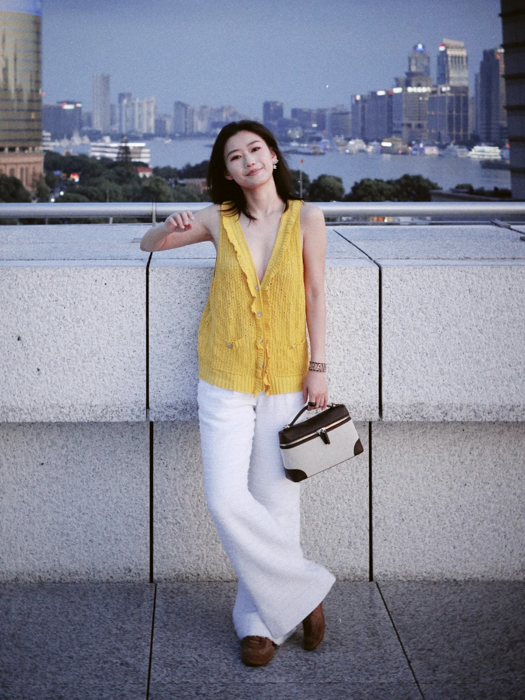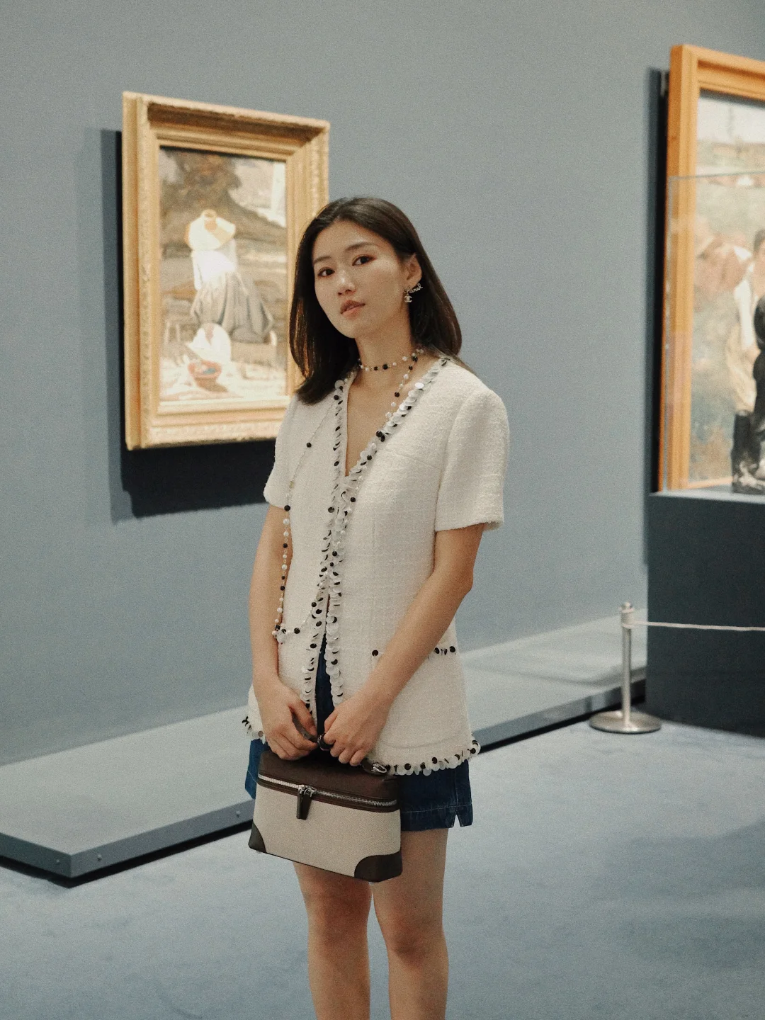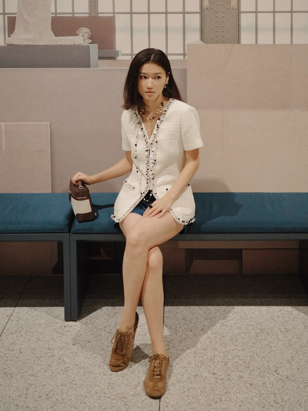 的粗花呢,每次出新款都会惊喜。 这件短袖外套可以从春夏穿到早秋, 正肩加微微收腰的版型, 会显得体态很好, 珠片给整件衣服增加了一些精致感和时髦感~ 混搭了条牛仔短裤,更Chill一些, 等入了秋,可以换成麂皮或是绒面的下装! 其实搭配P2的花呢长裤会很优雅, 但更喜欢混搭🦦 这条长裤宽松微喇, 很有老牌时装屋的质感! 🪞老钱风手拿包来自, 咖色皮拼帆布,太有质感, 包型硬挺也很好装东西~