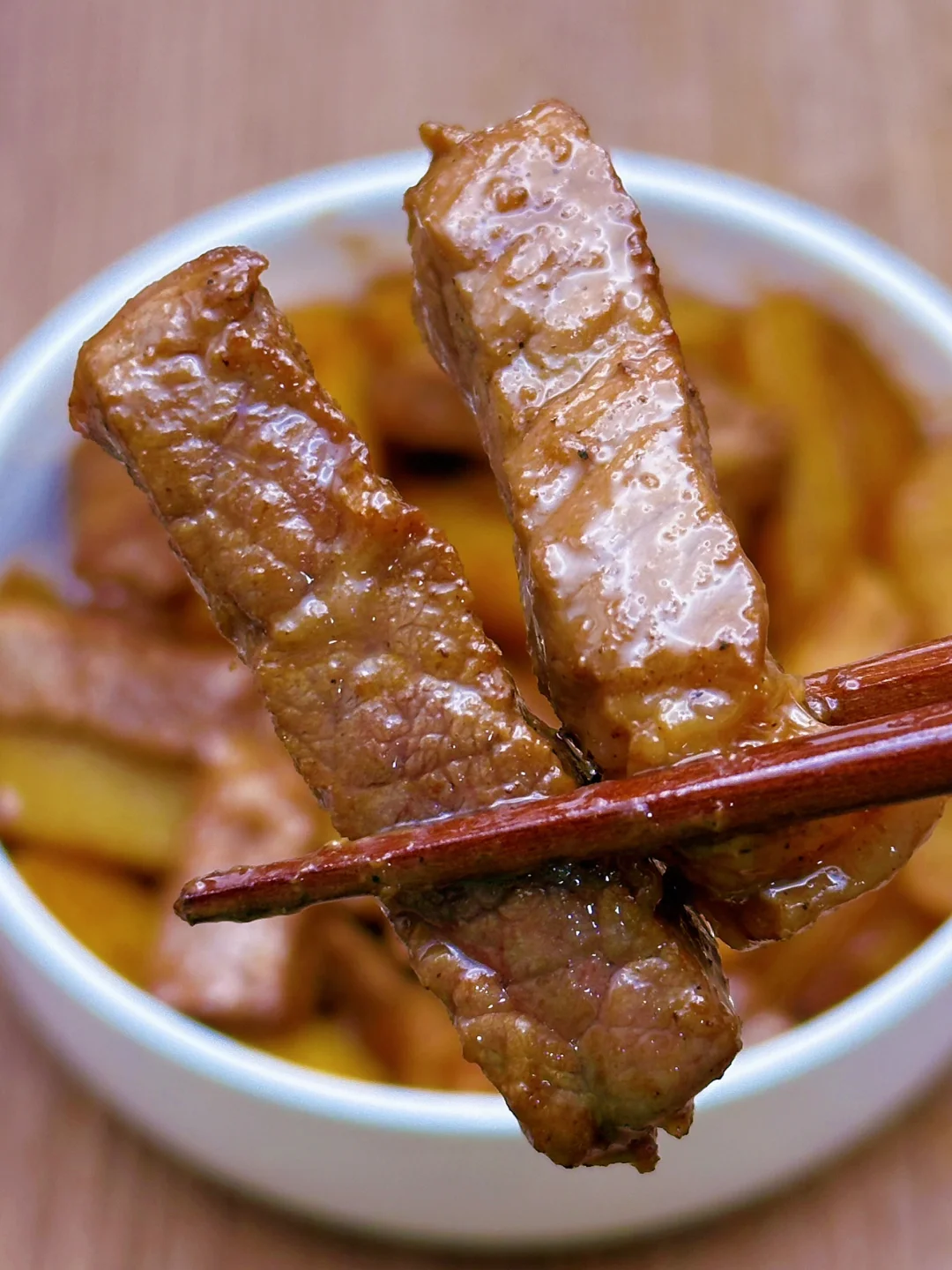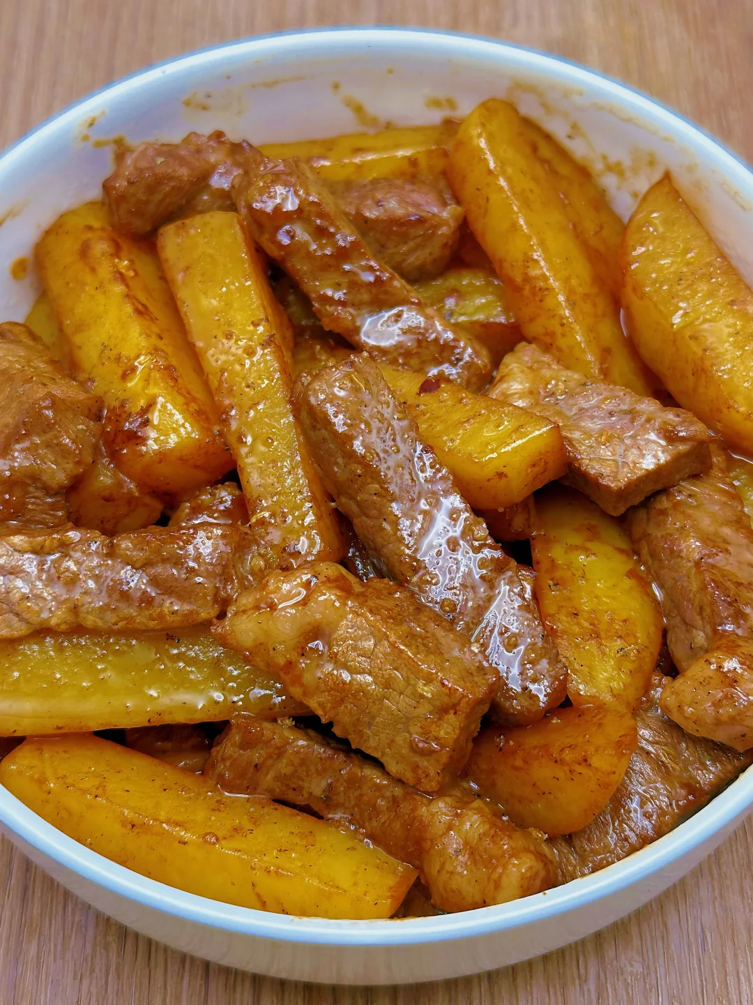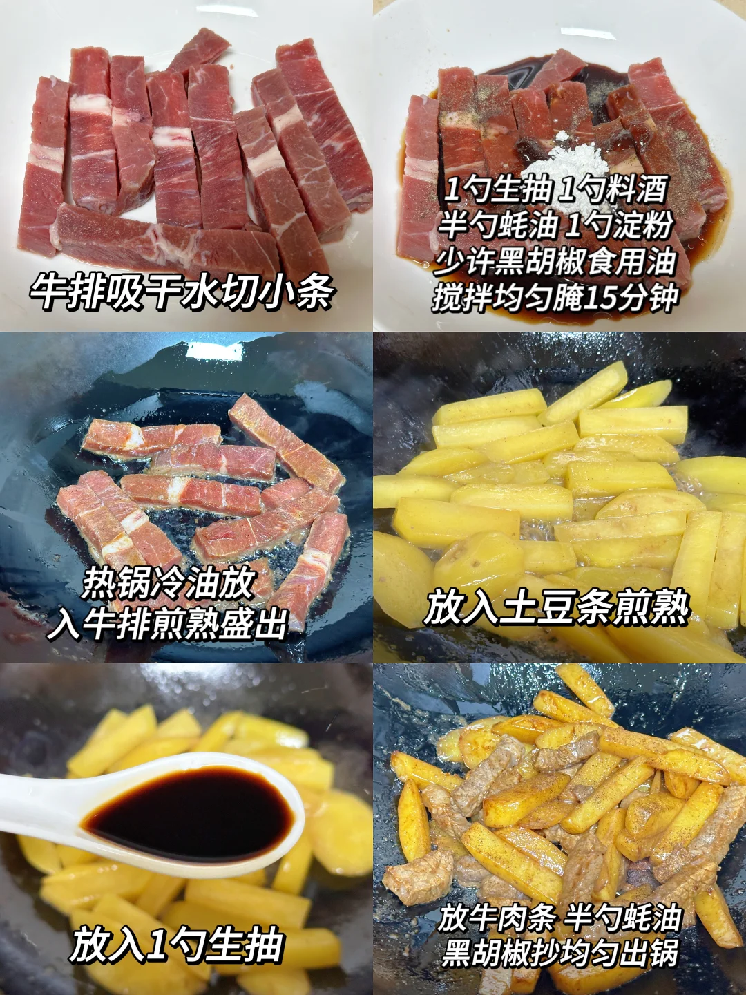 今天给姐妹们分享低卡高蛋白的牛排土豆煎锅,牛排鲜嫩多汁,越吃越香,土豆外焦里糯,真的巨巨巨好吃,而且还解馋,好吃不胖,做法简单,减脂期的姐妹们也可以放心吃,姐妹们赶紧试试吧~ 🥗食材:牛排、土豆 🥘做法:如图所示~ ✅牛排自然解冻后用厨房纸吸干水分,切成条状,加入1勺生抽➕半勺蚝油➕1勺料酒➕1勺淀粉➕1勺橄榄油➕少许黑胡椒碎抓匀腌制15分钟 1️⃣热锅冷油放入腌制好的牛肉条,煎至变色盛出备用 2️⃣锅中留底油,放入切条的土豆,煎至金黄,加1生抽倒入牛肉条➕半勺蚝油➕少许黑胡椒粉,加入香菜碎,翻炒均匀,即可开吃 减脂期也要对自己好好的!!吃肉肉不怕胖!
