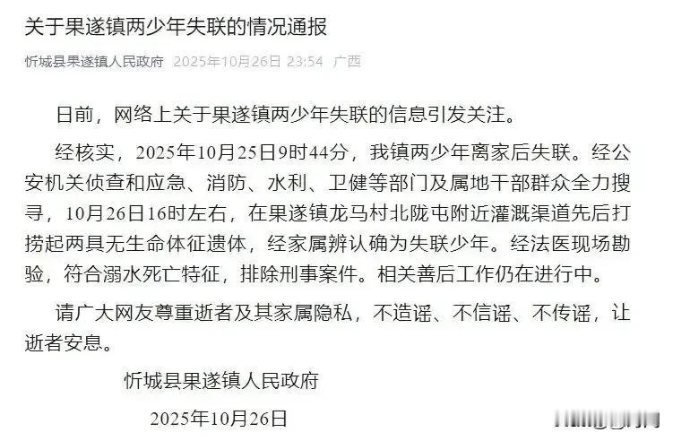 两名13岁男孩相约离家后失踪,结果失联1天后遗体在河道下游找到!事发2025年10月25日9时44分,广西省来宾市果遂镇两名13岁少年周末一起相约钓鱼,结果离家后就失联。 但是直到下午两人还没有回家,于是家人在网络发布寻人启事,并报警。村民只在一处河边发现两人骑的电瓶车和钥匙,以及钓鱼用具,两人携带的电话手表无法拨打成功。 后经公安等多部门全力搜寻,10月26日16时左右,在果遂镇龙马村北陇屯附近灌溉渠道先后打捞起两具无生命体征遗体,经家属辨认确为失联少年。经法医现场勘验,符合溺水死亡特征,排除刑事案件。 青少年的安全教育工作,已经是老生常谈的事,未成年人不允许骑电动车,不能私自到河边游玩,这些都是家长未有做好教育和管理工作的责任。