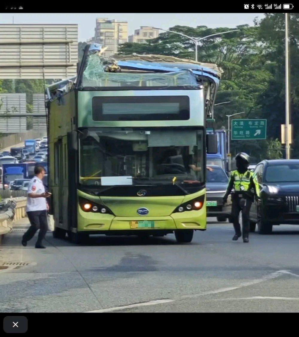 2025年10月26日下午2点左右,深圳发生了一件离谱事儿。一辆双层巴士在龙华区一处高架桥下被“剃头”,顶部严重挤压变形,现场玻璃碎片散落一地,周围围了不少人。网友把这一幕发上社交平台,引发众多关注。 事发后交警和救援人员很快赶到,将巴士拖了出来。记者联系深圳巴士集团,客服表示不清楚事故原因和有无乘客受伤;联系龙华交警大队,工作人员称事故在调查,后续会有专人回复,可截止发稿也没消息。也不知道这司机当时咋想的,希望调查结果能早日出来,给大家个说法。