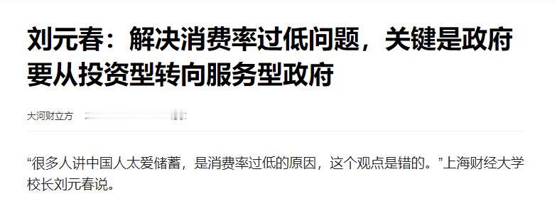 上海财经大学校长刘元春曾说:中国的消费率偏低,根本原因在于工资水平的不足,有人认为中国人热衷于存钱而不愿消费,这一观点是错误的,唯有将现有的投资型政府转变为服务型政府,才能真正破解这一困扰国家经济发展的难题。 这一论断,简直是戳破了不少似是而非的论调,先看一组扎心数据,2023年中国居民消费占GDP比重仅39.1%,在世界银行统计的149个经济体里排倒数第10,在人口800万以上的经济体中更是垫底,比全球均值56.6%低了近18个百分点。 这么低的消费率,总有人怪老百姓太爱存钱,可谁不想潇洒消费?账本早就给出了答案。 2024年一季度央行调查显示,61.8%的居民倾向于“更多储蓄”,这比例比2017年足足涨了19.5个百分点,但这可不是“热衷”存钱,而是钱包实在没底气,2024年居民可支配收入占GDP比重约43%,意味着人均GDP看似有1.3万美元,实际到居民手里的也就0.56万美元,平均每月才3800元左右,这水平连发达国家的一半都不到。 更关键的是工资增长长期跟不上经济步伐,初次分配中居民部门占比仅60.6%,钱没多挣,自然不敢乱花,把存钱归为“热衷”,实在是没看懂账本里的窘迫。 那老百姓的钱都去哪儿了?答案藏在那些不得不花的刚性支出里,2024年全国居民人均医疗保健支出2547元,看似绝对值不算高,但背后是社会保障体系的短板——我国再分配仅能缩小12.3%的基尼系数,连欧盟的三分之一都不到。 教育、养老、住房这三座“大山”压着,谁不得提前存钱防身?央行问卷早就显示,居民储蓄的主要动机是应对医疗、养老等未来支出,并非不愿消费,而是消费得起的不敢随便花,想花的又没底气,就像有人调侃的,不是不想逛商场,是房贷和医保缴费单比价签更显眼。 而问题的根子,其实在政府的角色定位上,过去投资型政府主导的发展模式,确实让GDP一路狂奔,2018到2023年GDP从93万亿冲到129万亿,但代价是消费空间被严重挤压,地方政府一门心思搞基建、拉投资,却在公共服务上欠了账:国企把超额利润拿去扩产能而非给居民分红,地方财政重投资轻民生,结果就是居民要自己为教育医疗买单,消费能力自然被稀释。 反观浙江苍南的例子,投入资金搞养老服务、办消费活动,仅以旧换新就撬动7亿消费,这说明只要公共服务跟上,消费潜力立马能释放。 所以,刘元春说要转成服务型政府,真是说到了点子上,2025年出台的《提振消费专项行动方案》已经释放信号,政策重心正在从短期发消费券,转向长期补民生短板,毕竟消费券是“兴奋剂”,公共服务才是“营养餐”,如果医保报销比例再高些,养老保障再扎实些,谁愿意把钱死死存着?韩国的经验也证明,同样是东亚文化圈,人家在相似发展阶段通过完善公共服务,让居民消费率稳定在48%以上,比我们现在高了近10个百分点。 说到底,提振消费从来不是让老百姓“少存钱多花钱”的口号游戏,而是要先解决“有钱花、敢花钱”的根本问题,工资水平提不上来,公共服务跟不上,再热闹的消费节也只是昙花一现。 从投资型到服务型政府的转身,本质上是把“造GDP”的重心,转回到“为人民造福利”上,当居民收入占比上去了,教育医疗有保障了,不用谁号召,消费自然会成为经济的硬支撑,毕竟对普通人来说,敢花钱的底气,永远来自鼓鼓的钱包和踏实的保障,这比任何消费刺激都管用。