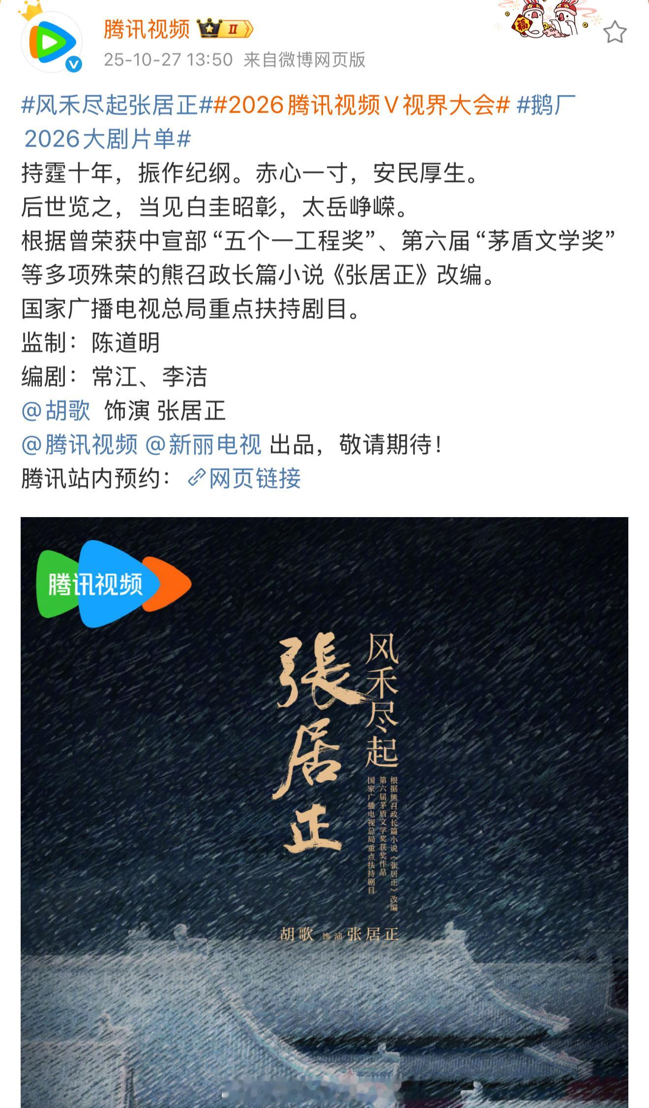 胡歌官宣出演《风禾尽起张居正》10年了又能看到老胡古装了期待开机[爱心][爱心]
