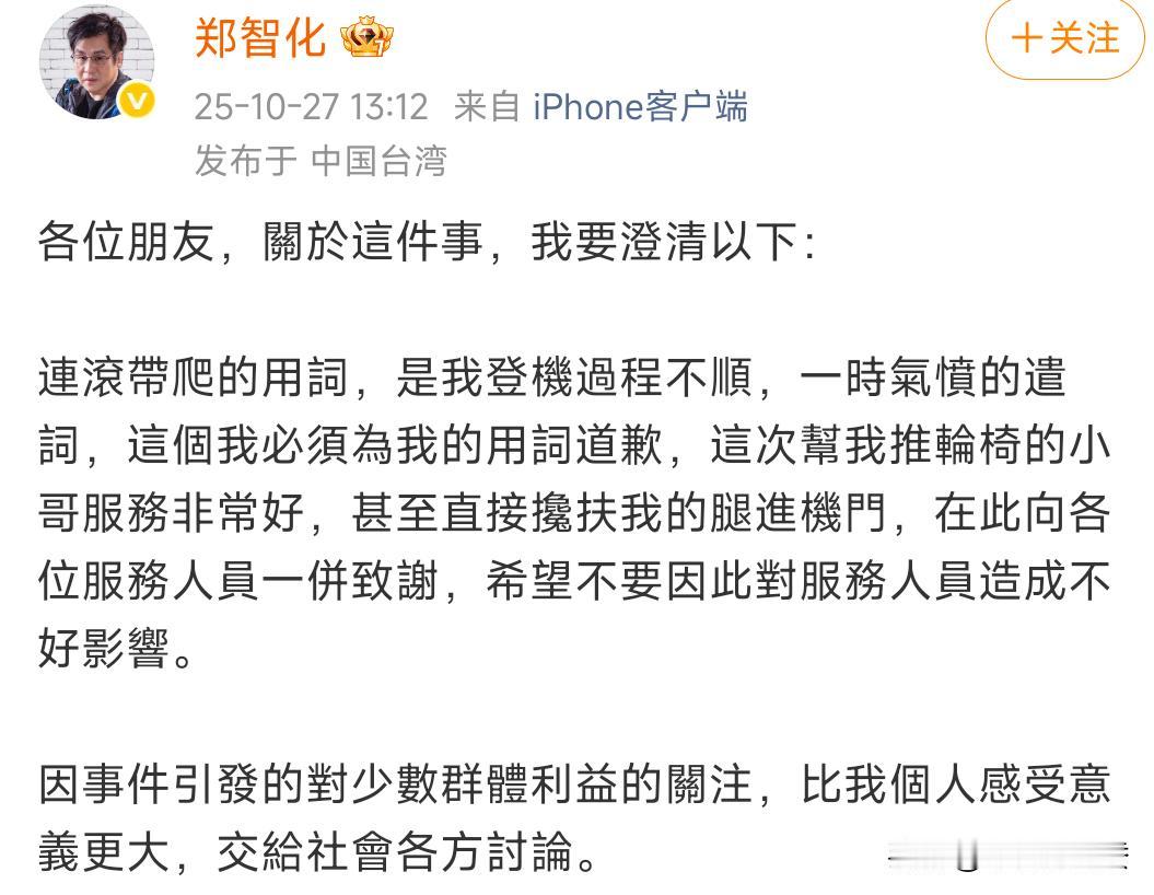 看了郑智化发的澄清声明,有点尴尬。 他承认用连滚带爬这个词不妥,也说推轮椅的小哥服务非常好,特意用非常二字,是相当满意的意思罗咯,还向服务人员道了谢。好吧,一切似乎都没问题,但之前说的“没人性”又算怎么回事? 一句没人性,一句连滚带爬,让网友自动脑补出残疾人登机的画面,赚足了同情分,却把机场推上热搜,承受着舆论压力。 监控视频一出来,他又发声明澄清,闹了半天,原来那些说法都是演绎的? 不管怎么样,这件事也给公众人物提了醒:对待公共事件,不能用情绪说话,其实最合适的办法是走正规投诉渠道。