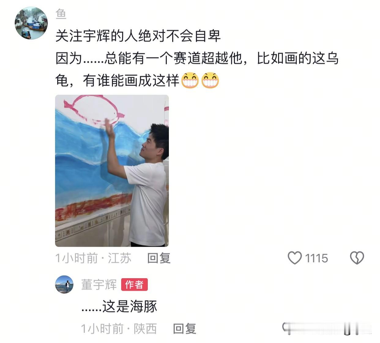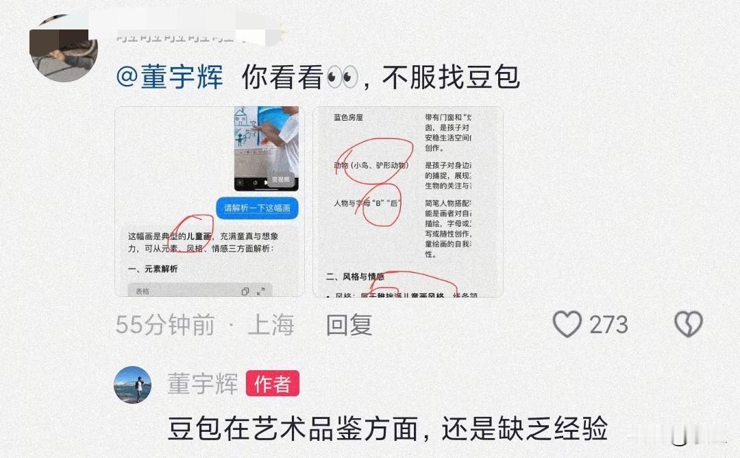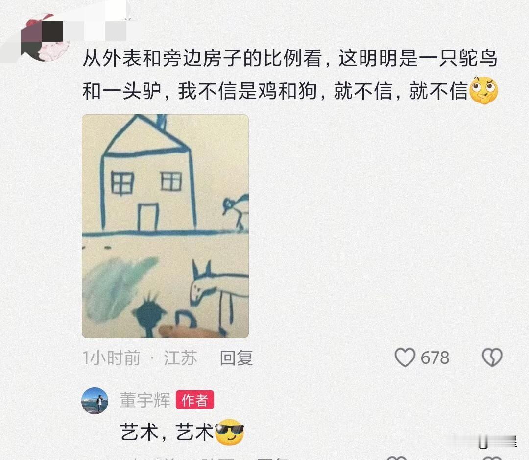 董宇辉说了,人基础画就不基础[偷笑] 当他跟张扬解说自己的作品时 充分说明了一件事 张扬还是挺善良的[笑哭] 与此同时 评论区已经乱成了一锅粥[笑哭] 董宇辉忙的不可开交 各种找补 有网友说他画的明明是鸵鸟和驴 他说这是艺术[大笑] 有人说他画的是乌龟 他纠正这是海豚 有人拿豆包的评判来打击彪哥 彪哥说豆包在艺术品鉴方面缺乏经验[偷笑] 这又充分说明了一件事 “天塌了有董宇辉的嘴顶着”[耶]