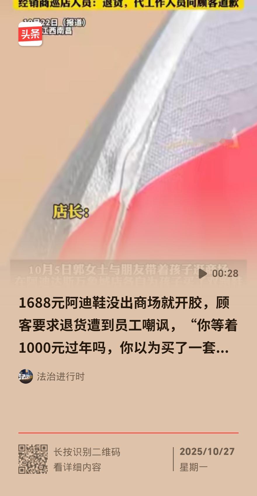 10 月 5 号国庆假期,郭女士揣着 1699 元给孩子买了双阿迪 “零系列” 跑鞋,结果鞋没出商场大门,鞋底就先 “罢工” 开胶了。阿迪达斯运动鞋 阿迪运动鞋 零感鞋