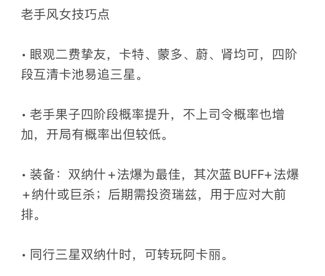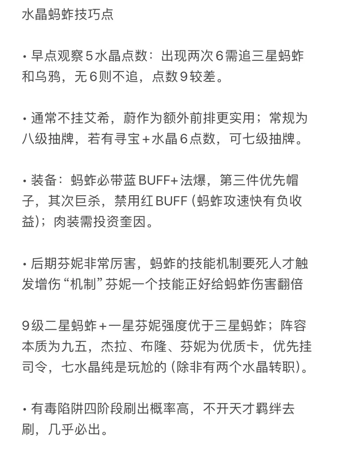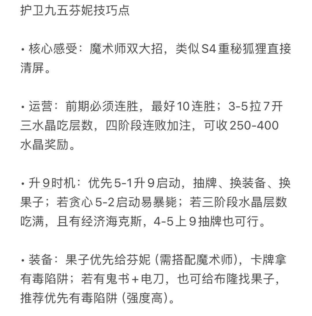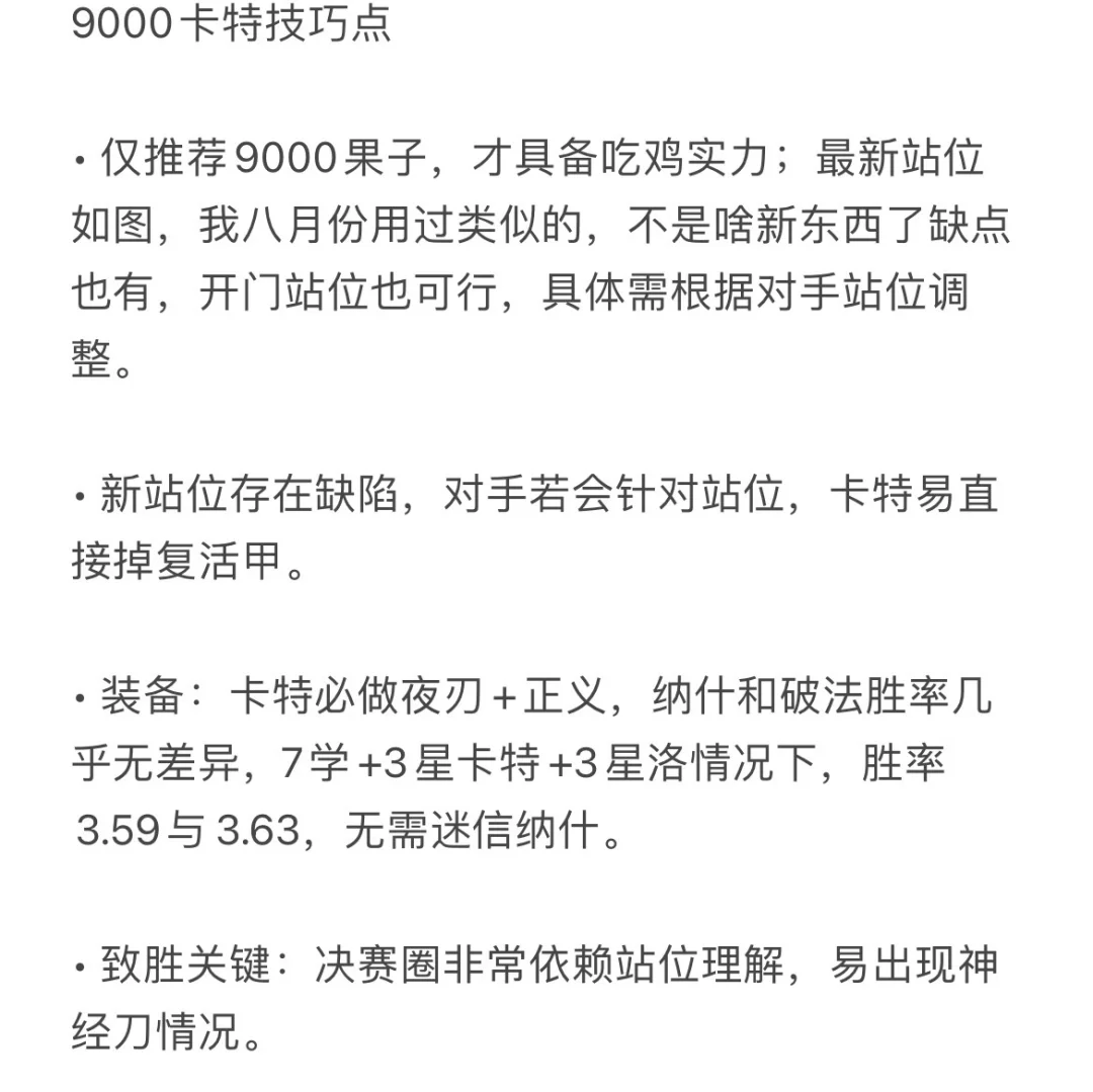 当前版本能玩的阵容很多,包括特殊玩法:缥缈肾、凯南/盖伦/蒙多/蔚/妮蔻的英雄强化,以及盖伦、大嘴、阿卡丽的特殊神器玩法,还有叠血盖伦这类特殊机制玩法,算下来20套往上只多不少。 但普通玩家没必要花太多精力全搞明白,选择简单公式或许才是“聪明”的玩法。 老手风女技巧点 • 眼观二费挚友,卡特、蒙多、蔚、肾均可,四阶段互清卡池易追三星。 • 老手果子四阶段概率提升,不上司令概率也增加,开局有概率出但较低。 • 装备:双纳什+法爆为最佳,其次蓝BUFF+法爆+纳什或巨杀;后期需投资瑞兹,用于应对大前排。 • 同行三星双纳什时,可转玩阿卡丽。 水晶蚂蚱技巧点 • 早点观察5水晶点数:出现两次6需追三星蚂蚱和乌鸦,无6则不追,点数9较差。 • 通常不挂艾希,蔚作为额外前排更实用;常规为八级抽牌,若有寻宝+水晶6点数,可七级抽牌。 • 装备:蚂蚱必带蓝BUFF+法爆,第三件优先帽子,其次巨杀,禁用红BUFF(蚂蚱攻速快有负收益);肉装需投资奎因。 • 后期芬妮强度高,9级二星蚂蚱+一星芬妮强度优于三星蚂蚱;阵容本质为九五,杰拉、布隆、芬妮为优质卡,优先挂司令,七水晶纯是玩尬的(除非有两个水晶转职)。 • 有毒陷阱四阶段刷出概率高,不开天才羁绊去刷,几乎必出。 9000卡特技巧点 • 仅推荐9000果子,才具备吃鸡实力;最新站位如图,我八月份用过类似的,不是啥新东西了缺点也有,开门站位也可行,具体需根据对手站位调整。 • 新站位存在缺陷,对手若会针对站位,卡特易直接掉复活甲。 • 装备:卡特必做夜刃+正义,纳什和破法胜率几乎无差异,7学+3星卡特+3星洛情况下,胜率3.59与3.63,无需迷信纳什。 • 致胜关键:决赛圈非常依赖站位理解,易出现神经刀情况。 护卫九五芬妮技巧点 • 核心感受:魔术师双大招,类似S4重秘狐狸直接清屏 • 运营:前期必须连胜,最好10连胜;3-5拉7开三水晶吃层数,四阶段连败加注,可收250-400水晶奖励。 • 升9时机:优先5-1升9启动,抽牌、换装备、换果子;若贪心5-2启动易暴毙;若三阶段水晶层数吃满,且有经济海克斯,4-5上9抽牌也可行。 • 装备:果子优先给芬妮(需搭配魔术师),卡牌拿有毒陷阱;若有鬼书+电刀,也可给布隆找果子,推荐优先有毒陷阱(强度高)。
