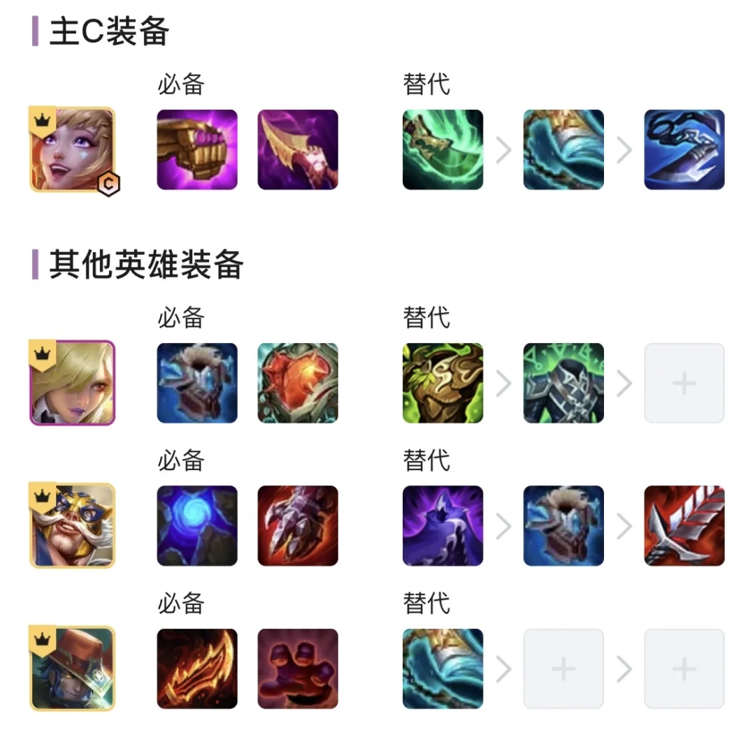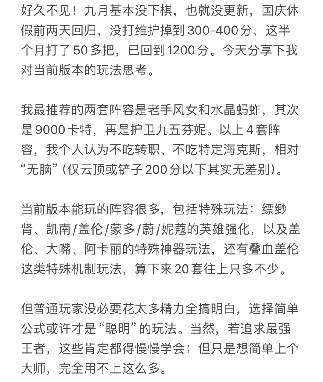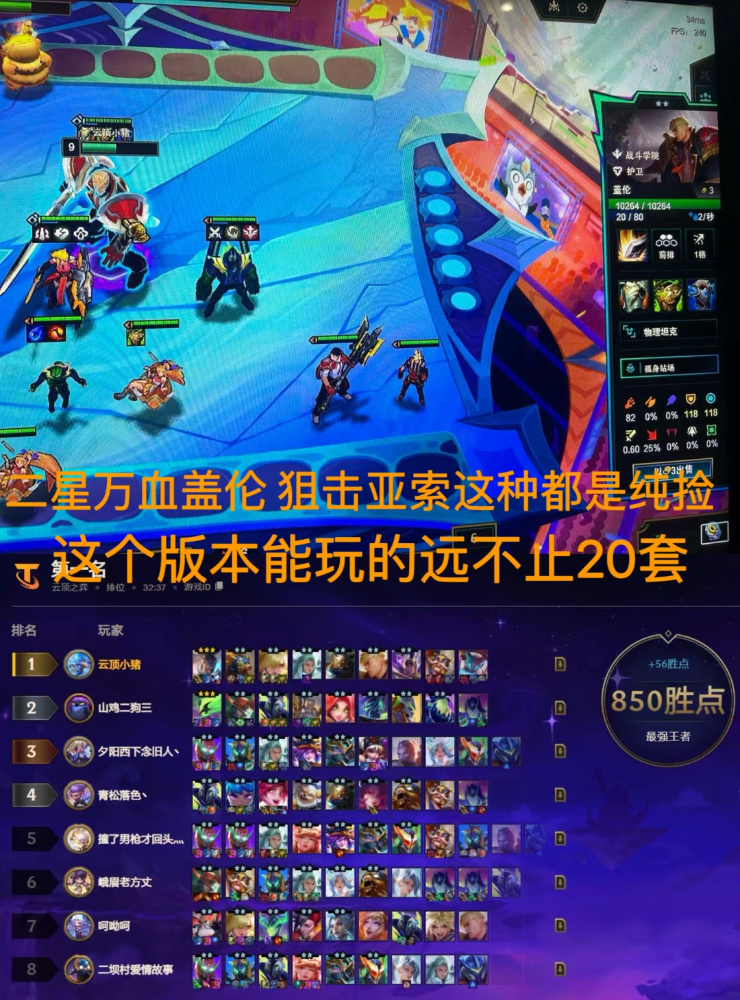 当前版本能玩的阵容很多,包括特殊玩法:缥缈肾、凯南/盖伦/蒙多/蔚/妮蔻的英雄强化,以及盖伦、大嘴、阿卡丽的特殊神器玩法,还有叠血盖伦这类特殊机制玩法,算下来20套往上只多不少。 但普通玩家没必要花太多精力全搞明白,选择简单公式或许才是“聪明”的玩法。 老手风女技巧点 • 眼观二费挚友,卡特、蒙多、蔚、肾均可,四阶段互清卡池易追三星。 • 老手果子四阶段概率提升,不上司令概率也增加,开局有概率出但较低。 • 装备:双纳什+法爆为最佳,其次蓝BUFF+法爆+纳什或巨杀;后期需投资瑞兹,用于应对大前排。 • 同行三星双纳什时,可转玩阿卡丽。 水晶蚂蚱技巧点 • 早点观察5水晶点数:出现两次6需追三星蚂蚱和乌鸦,无6则不追,点数9较差。 • 通常不挂艾希,蔚作为额外前排更实用;常规为八级抽牌,若有寻宝+水晶6点数,可七级抽牌。 • 装备:蚂蚱必带蓝BUFF+法爆,第三件优先帽子,其次巨杀,禁用红BUFF(蚂蚱攻速快有负收益);肉装需投资奎因。 • 后期芬妮强度高,9级二星蚂蚱+一星芬妮强度优于三星蚂蚱;阵容本质为九五,杰拉、布隆、芬妮为优质卡,优先挂司令,七水晶纯是玩尬的(除非有两个水晶转职)。 • 有毒陷阱四阶段刷出概率高,不开天才羁绊去刷,几乎必出。 9000卡特技巧点 • 仅推荐9000果子,才具备吃鸡实力;最新站位如图,我八月份用过类似的,不是啥新东西了缺点也有,开门站位也可行,具体需根据对手站位调整。 • 新站位存在缺陷,对手若会针对站位,卡特易直接掉复活甲。 • 装备:卡特必做夜刃+正义,纳什和破法胜率几乎无差异,7学+3星卡特+3星洛情况下,胜率3.59与3.63,无需迷信纳什。 • 致胜关键:决赛圈非常依赖站位理解,易出现神经刀情况。 护卫九五芬妮技巧点 • 核心感受:魔术师双大招,类似S4重秘狐狸直接清屏 • 运营:前期必须连胜,最好10连胜;3-5拉7开三水晶吃层数,四阶段连败加注,可收250-400水晶奖励。 • 升9时机:优先5-1升9启动,抽牌、换装备、换果子;若贪心5-2启动易暴毙;若三阶段水晶层数吃满,且有经济海克斯,4-5上9抽牌也可行。 • 装备:果子优先给芬妮(需搭配魔术师),卡牌拿有毒陷阱;若有鬼书+电刀,也可给布隆找果子,推荐优先有毒陷阱(强度高)。