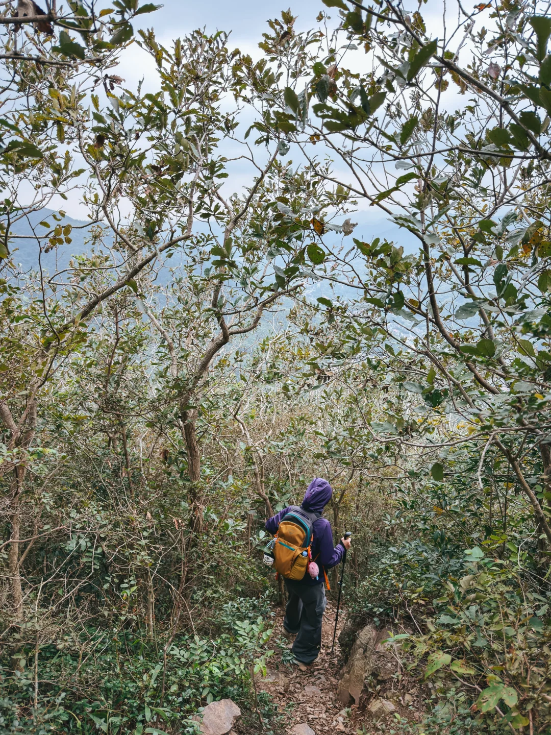 从望海尖下坡去往东海龙椅的路段略陡,且窄,需要特别注意脚下,不过一路下去边上都有树木可以辅助。通往龙椅的地方有一个不太起眼的小岔口,很容易错过!一定要盯着轨迹导航,我们差点就走过头了。