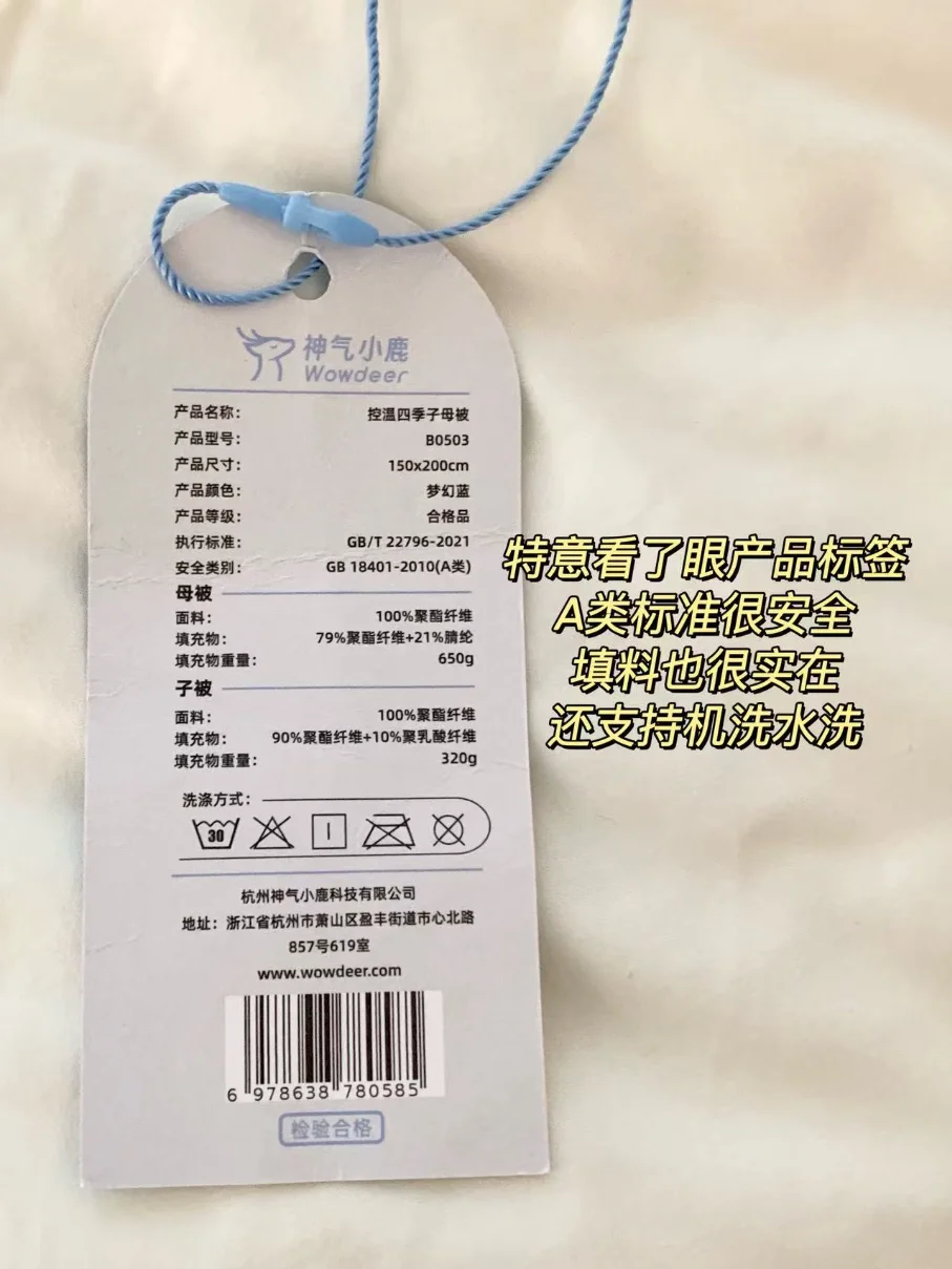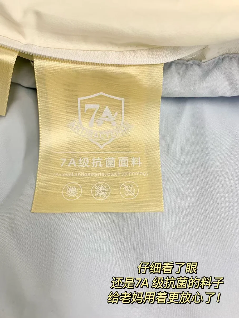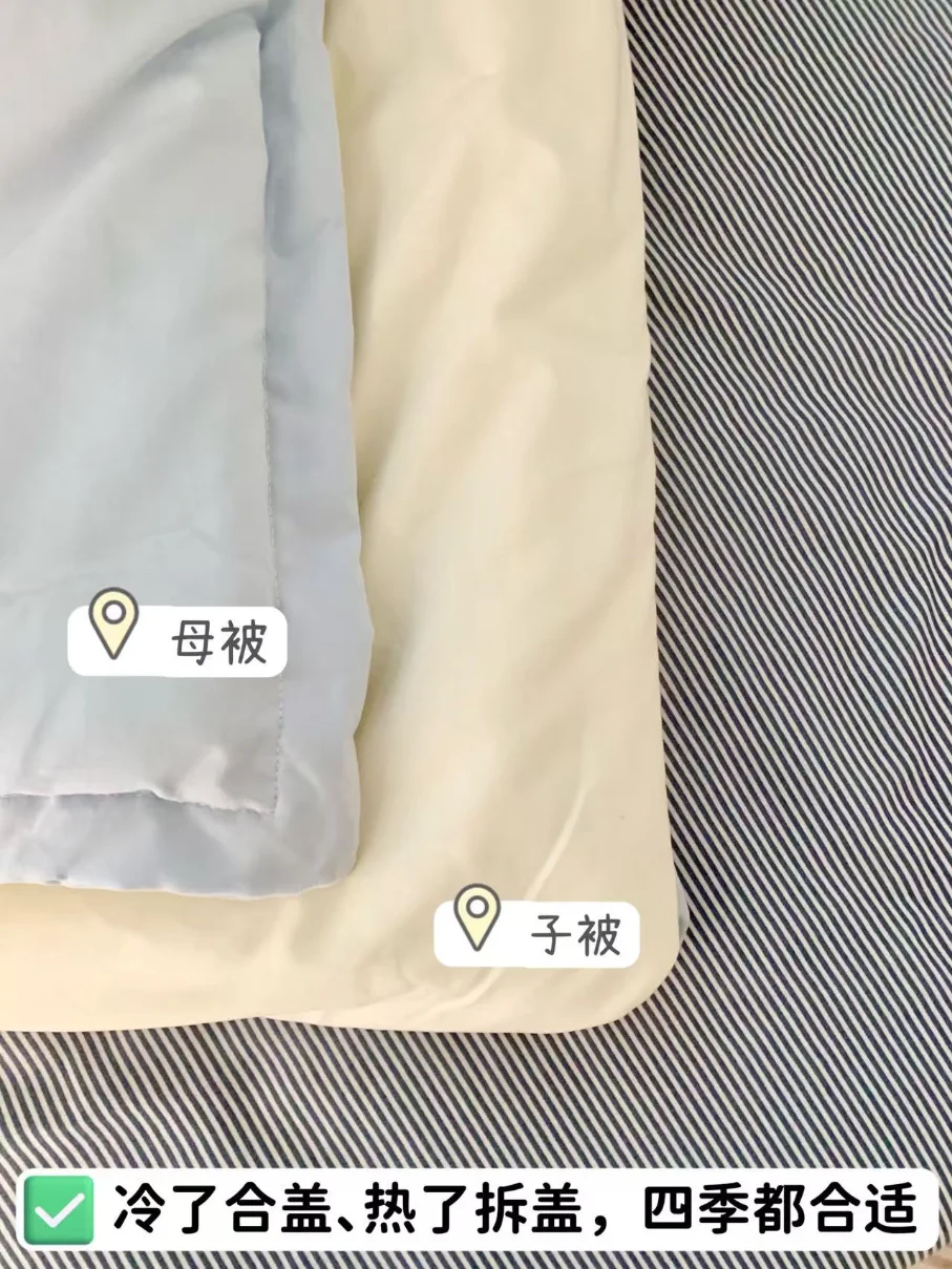 它不像有的被子要么冬天不暖、夏天闷黏,双层控温特别贴心:母被蓄热锁温,子被排湿透气,冷了合盖、热了拆盖,四季都合适;磨毛面料软乎乎的,,还能免被套直接机洗,还能给老妈省点拆洗被套的麻烦了。仔细看了眼,是7A 级抗菌的料子,给老妈用着也能更放心!