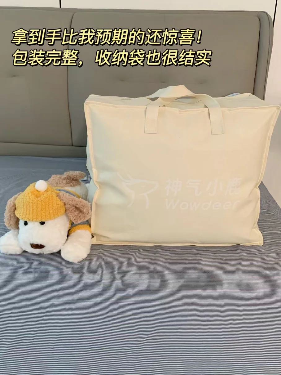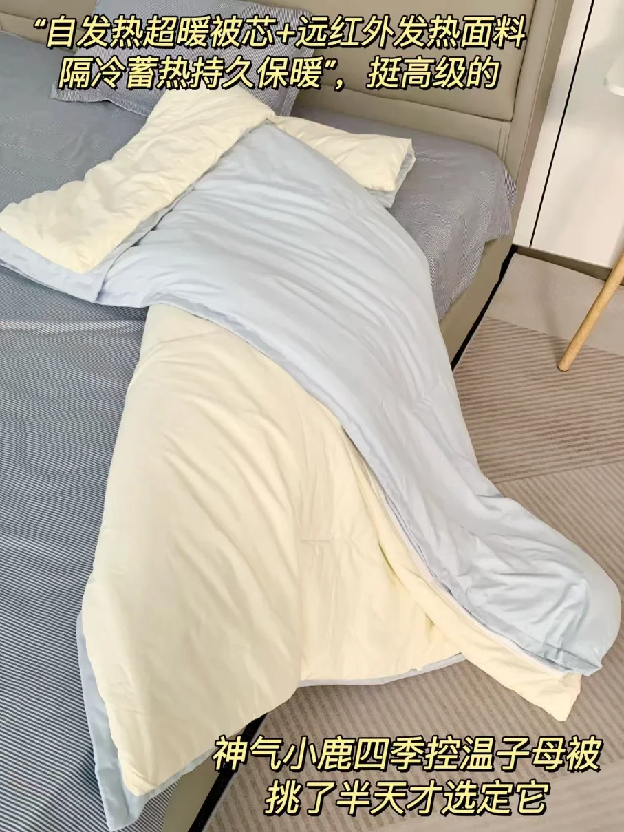 纠结好久选了神气小鹿四季控温子母被。其实早在去年,我就给我妈买过他家的枕头,今年双 11 前,我看我妈那床秋冬被也该换了,刚好刷到他家出的这款四季控温子母被,说是“自发热超暖被芯+远红外发热面料,隔冷蓄热持久保暖”,挺高级的,想着给爸妈换个更好的,就果断下单了,没想到拿到手比我预期的还惊喜!