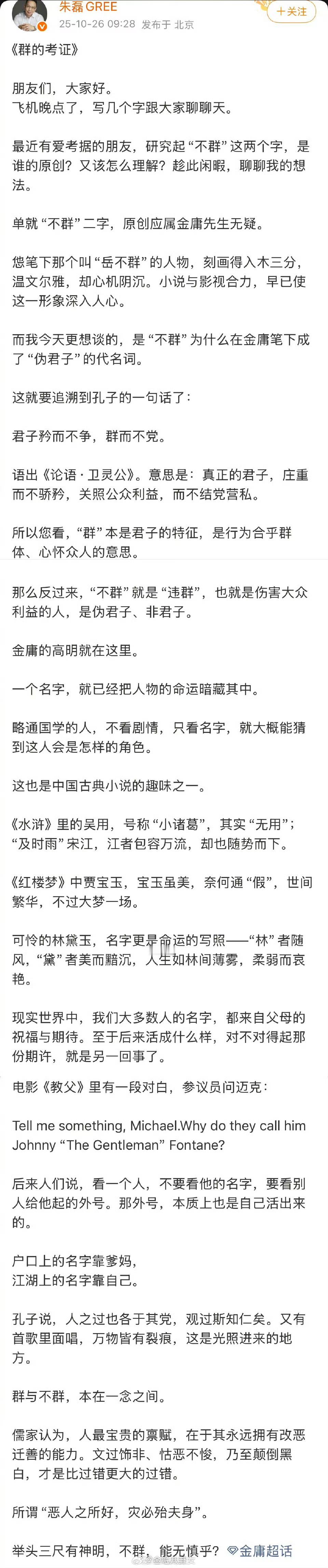 格力高管朱磊再发长文《群的考证》:“不群”就是伪君子、非君子[doge]