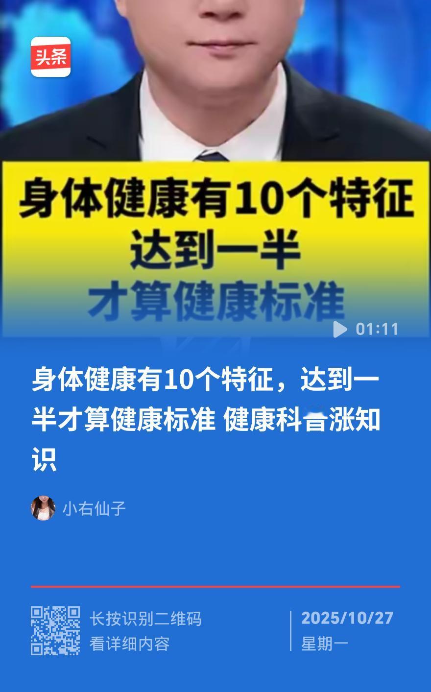 别再瞎买保健品!身体有这10个“信号”,才是真健康,比体检报告还准 现在人养生卷得厉害,保健品堆成山,体检单吓破胆,其实身体早把健康密码写在脸上了!这10个特征要是占得多,说明你比同龄人健康一大截,赶紧对照自查。 伤口愈合快的人偷着乐吧!切菜划道口子、烫个水泡,两三天就结痂,这说明血液凝血像“速干胶”,白细胞抗菌堪比“保安队”,血管状态杠杠的。反观有人蹭破皮半个月还流脓,一碰就青一块紫一块,可得赶紧去检查。 头发亮泽的人藏着“气血密码”。老辈说“发为血之余”,头发顺滑有光,说明肝肾精血足,营养没缺项。那些头发一抓掉一把、干枯像稻草的,要么熬夜太多,要么气血跟不上,得赶紧调。 每天1-2次排便太关键!肠道就像“垃圾处理厂”,按时排空才不会堆毒素。长期便秘的人,内分泌容易乱,整个人都蔫蔫的,早上喝杯温水就能帮肠道“启动”,超管用。 体重稳如秤砣的人太幸运。一个月体重波动不超4公斤 ,说明身体代谢平衡,要是突然暴瘦暴胖,可能是身体在“报警”。 睡得香的人免疫力自带“防护罩”。躺下半小时睡着,一觉到天亮,比吃保健品管用。长期失眠熬夜,器官老得快,小毛病全找上门。 指甲红润无棱的人气血足。指甲粉粉嫩嫩没竖纹,说明不缺钙、内分泌稳,肝脏这个“大将军”也给力。 肚子上没赘肉太加分!硬邦邦的“啤酒肚”可不是小事,高血压、糖尿病都爱找这类人。 性格开朗的人自带“健康buff”,遇事不钻牛角尖,身体酶活性都更高。饮食均衡、坚持运动就更不用说了,都是健康的“基石”。 这些信号比任何养生套路都实在,对照看看,比瞎买补品靠谱多了!保健品 保健品养生误区 保健品养生骗局