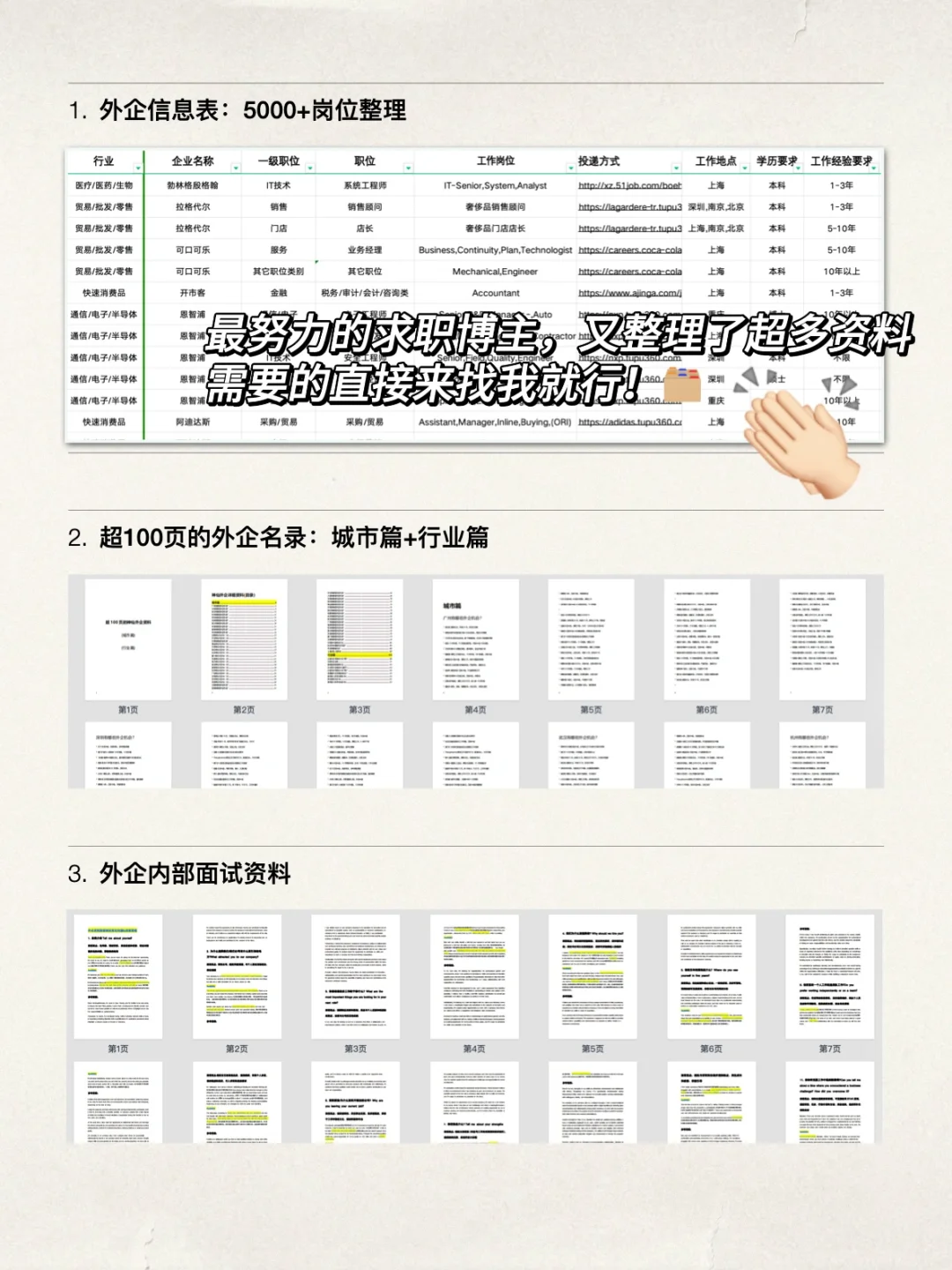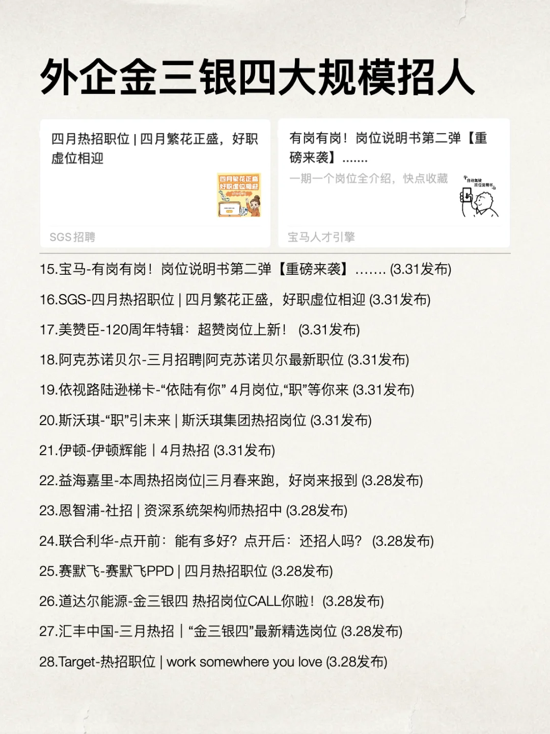 金三银四外企放hc的速度也太快了,看了下岗位类型还是比较丰富的,招聘很有针对性,想跳槽的,一定要把握住金三银四这波机会,还是很好拿offer的!✊🏻 . ✨为什么建议大家去试试外企? ✔️WLB (work-life balance)可以说是外企最大的代名词了,一般都是双休、无 966、年假 10多天起步、有些还能灵活居家办公,而且福利齐全、氛围轻松、对女性也比较友好,相对来说,外企确实是很多人的白月光 . 坚持日更✊🏻,希望大家在找工作路上都能顺利拿offer! .