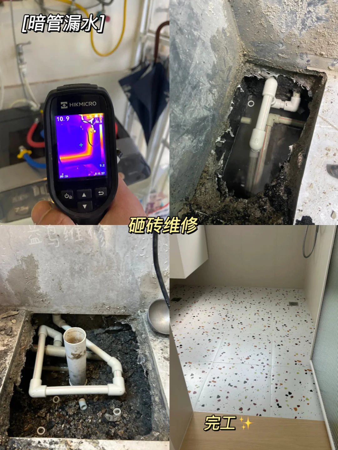 📝维修步骤:先用听漏仪精准找到暗管的漏水点,然后只需要凿开漏水点对应位置的瓷砖(尽量控制在 1-2 块砖的范围,减少不必要的损失),修复好暗管后,再重新铺贴瓷砖即可