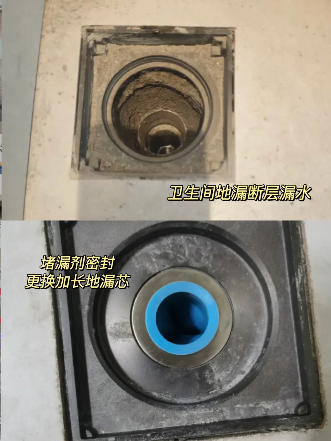 📝维修步骤:先把卫生间的地漏拆开,用堵漏剂把断层的缝隙彻底封堵好,然后更换一个加长的地漏芯,就能有效解决漏水问题