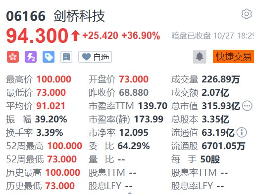 格隆汇10月27日|剑桥科技(6166.HK)将于10月28日(周二)在香港挂牌。截至收盘,富途证券的暗盘交易显示报价94.3港元,较招股价68.88港元上涨36.9%,每手50股,不计手续费,每手赚1271港元。