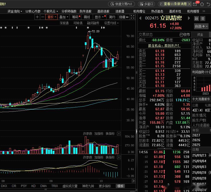 立讯精密,前两天我坐了个电梯,今天在苹果17大卖的消息刺激下,一度非常接近涨停,我也是在62.28元选择减半仓。