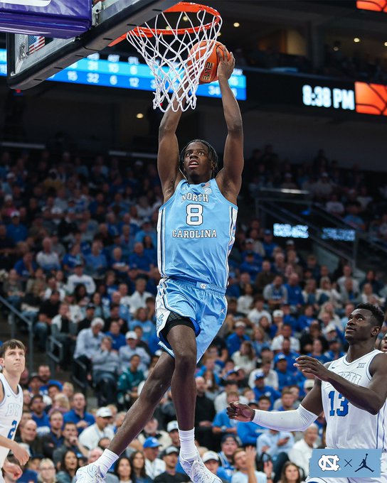 北卡球员凯莱布-威尔逊出场33分钟,得到22分10篮板1抢断3盖帽,投篮17中9。