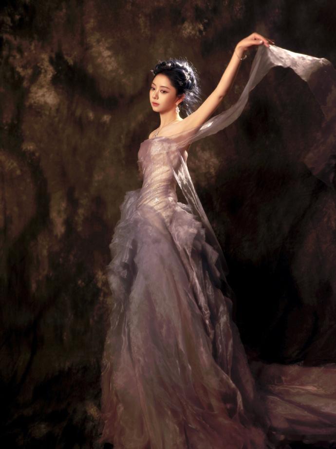 谭松韵紫色抹胸纱裙 谭松韵紫色抹胸纱裙,谭松韵腾讯视界大会造型图,完全就是优雅复古的油画美人啊~