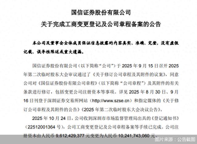 北京商报讯(记者李海媛)10月27日,国信证券发布完成工商变更登记及公司章程备案的公告表示,10月24日,公司工商变更登记及公司章程备案等手续已完成。公司注册资本由96.12亿元变更为102.42亿元。